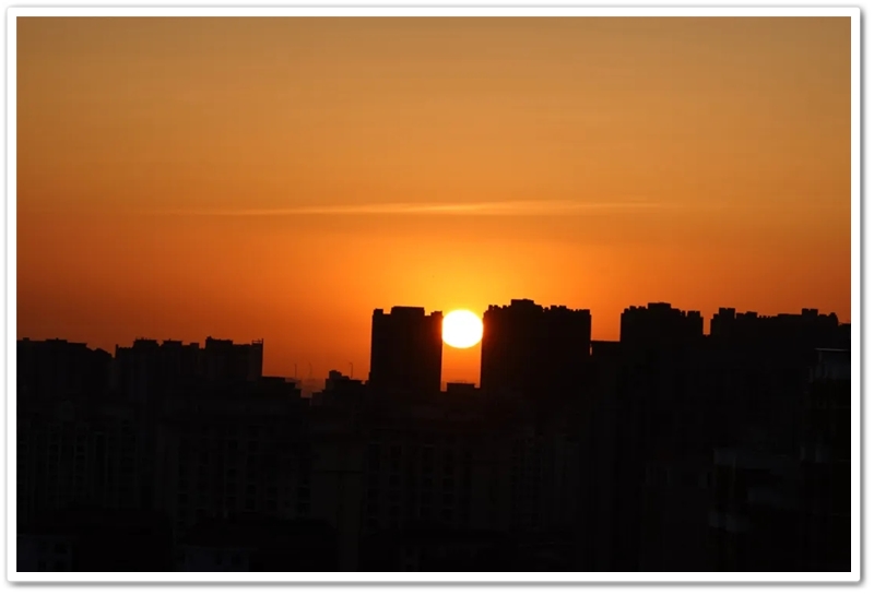 晨起,闹钟唤醒时,窗外朝霞正悄然染透半边天,离日出约莫还有十数分钟。穿衣洗漱的工夫,再望向窗外,那朝阳恰好从两幢三十多层的高楼间隙中缓缓升起。原以为新疆的朝阳会来得迟些,不想竟在七点露了面,倒也给人一份意外的惊喜。