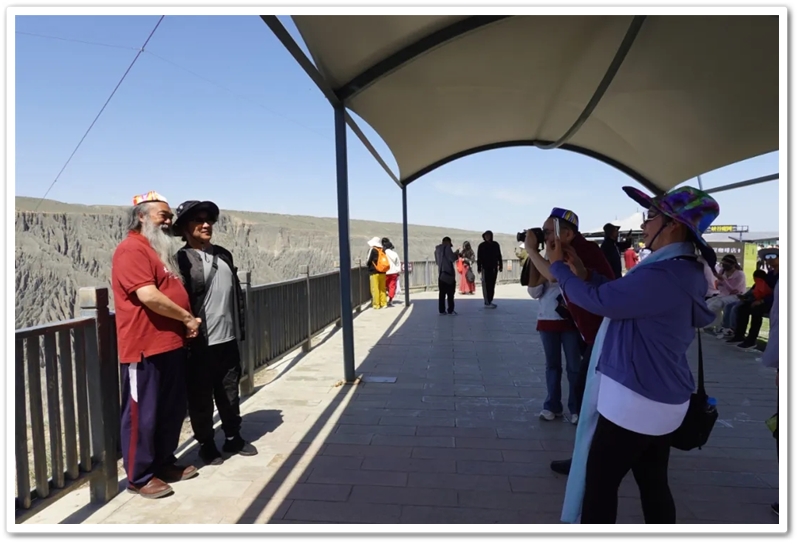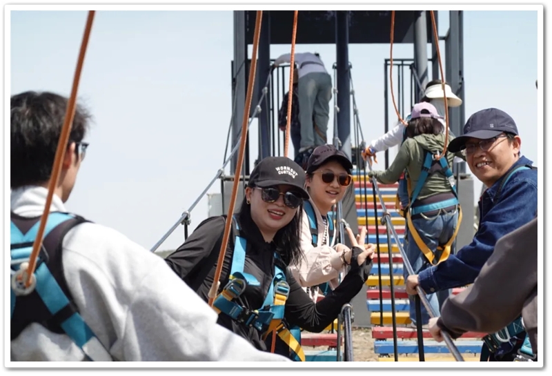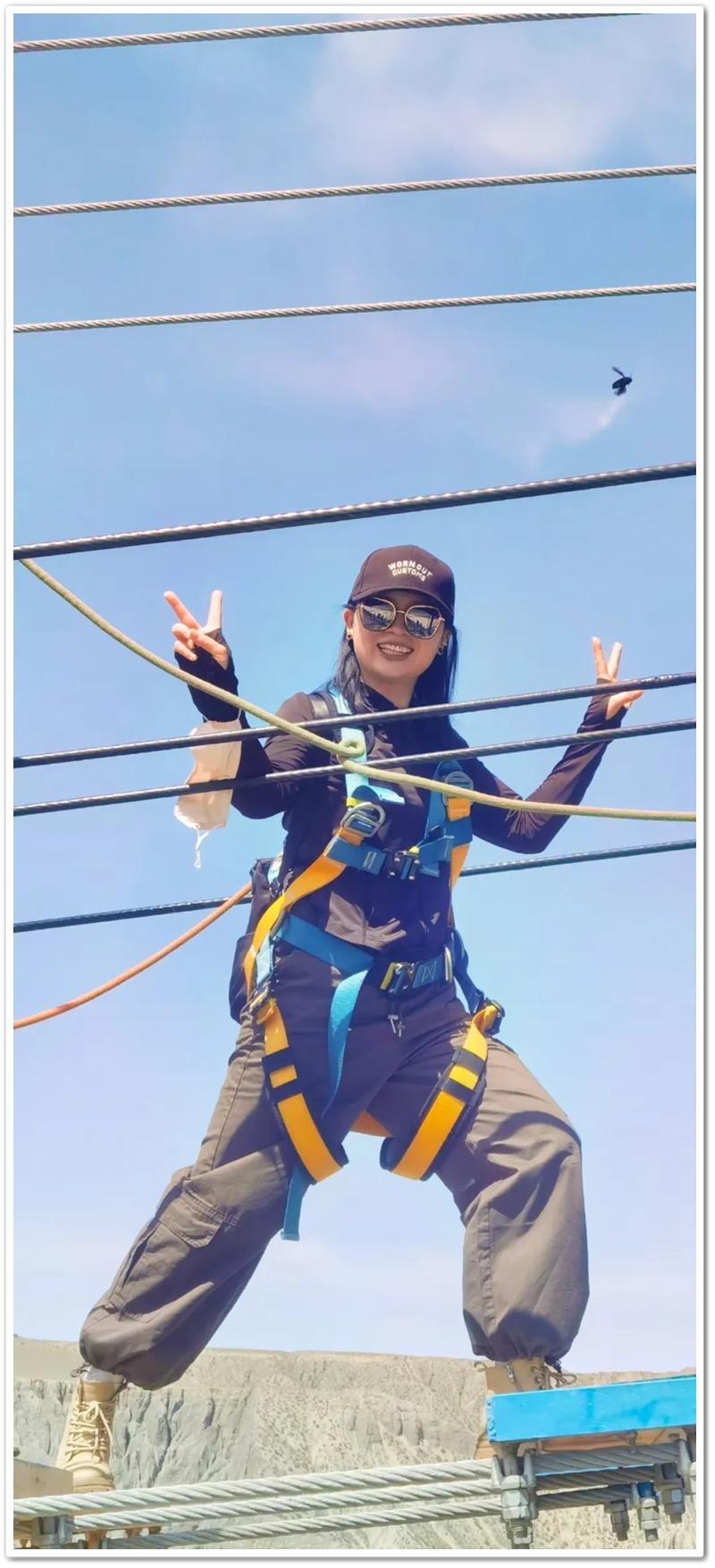 女老师们戴着丝巾,凹出造型,花枝招展着在峡谷边的风铃、石柱旁拍照打卡,轻盈的身影与壮丽的峡谷景色相映成画;男老师们戴着小方帽,在各个惊险刺激的游乐项目中挑战自我,欢声笑语在峡谷上空反复回荡。尽情游玩两个多小时,集合呼声响起时,却仍觉意犹未尽。