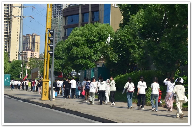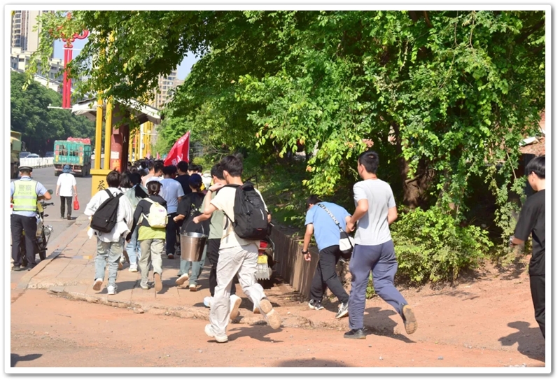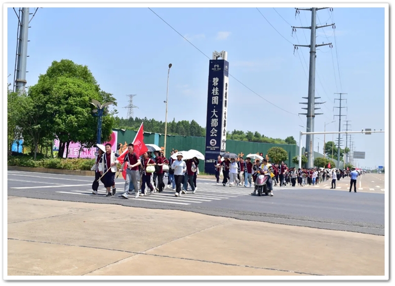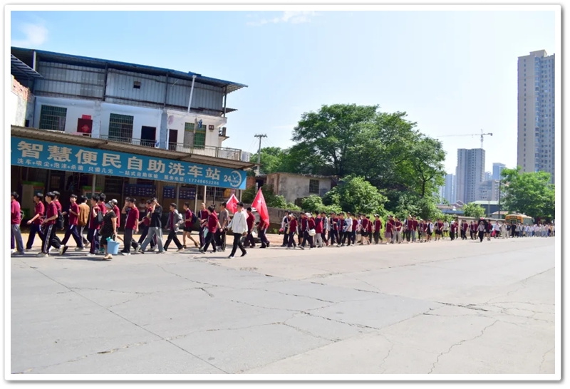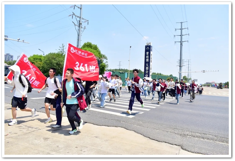 上午8:20,随着总指挥的哨声划破晴空,罗校长在最前方举旗带队,年级领导指挥方阵,各位班主任紧随队伍,22个班级高举旗帜,斗志昂扬,如蜿蜒的长龙依次出发。穿过南大门时,队伍右转踏上新城一路,107国道上的车流仿佛被这群少年的朝气感染。青春的人流穿过热闹的街道,路口有交警们为同学们保驾护航,老师们为同学们打气加油,罗校长在途中带领同学们高喊班级口号,鼓舞士气,少年们意气风发,气势如虹。