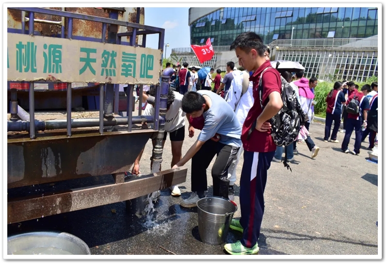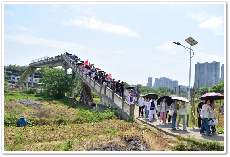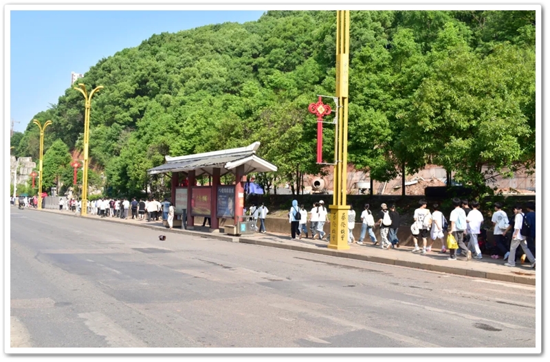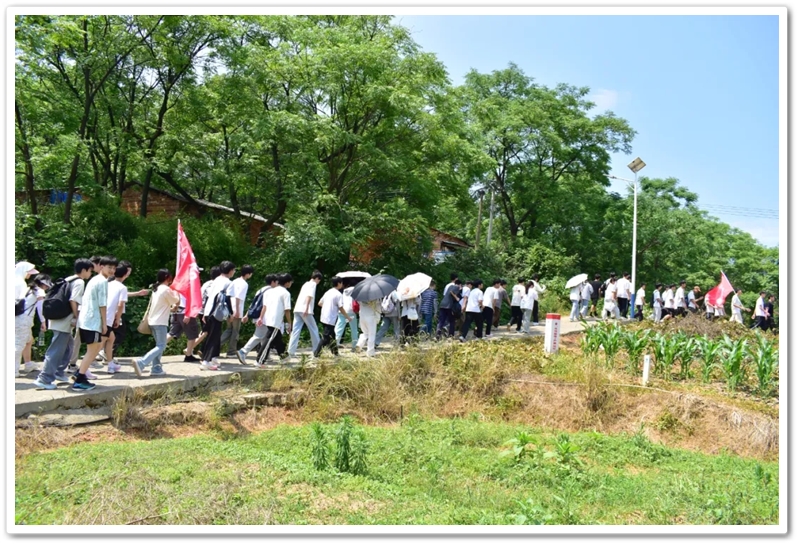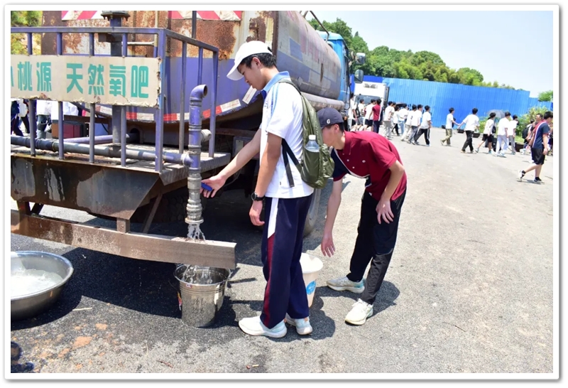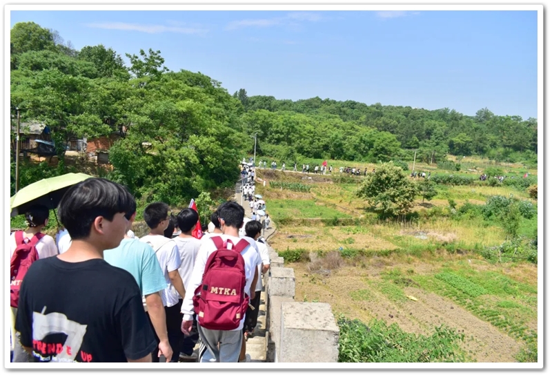转入南平亭路的乡间小道,真正的考验方才开始。野花芬芳,蝴蝶翩然,草木青葱,空气清新,但泥路上散落的碎石考验着鞋底的抓地力,五月的暖阳逐渐攀上中天。同学们额角沁出细密汗珠,领水处的老师们早已等候多时。补充水分,重整旗鼓,同学们浩浩荡荡地继续前行。