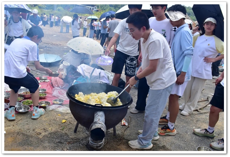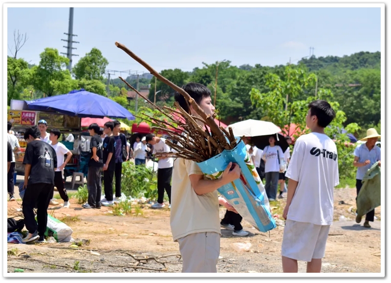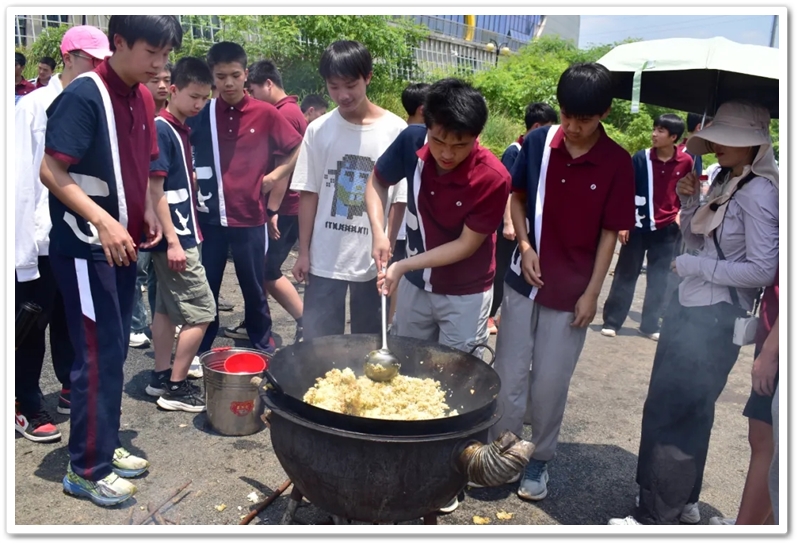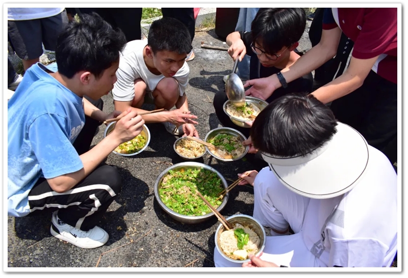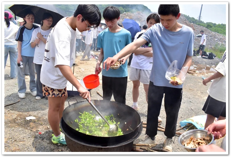 全民健身中心旁的空地上,二十二缕炊烟次第升起。各班划分的“厨房战区”里,班级内部的小组各司其职,为了那口热乎的午饭争分夺秒。“先放纸,再放柴”,烧火组的同学拿着火柴目光坚定。“先蛋炒饭,再辣椒炒肉,最后下面”放下写字的笔,掌勺的同学拿起做饭的铲,思路清晰,指挥有度。临时灶台里的火越烧越旺,炽热的红染在了同学们的脸上。当金黄的炒饭和热气蒸腾的面条终于端上野餐垫,少年们在这一堂实践课上应体悟了“粒粒皆辛苦”的真意。