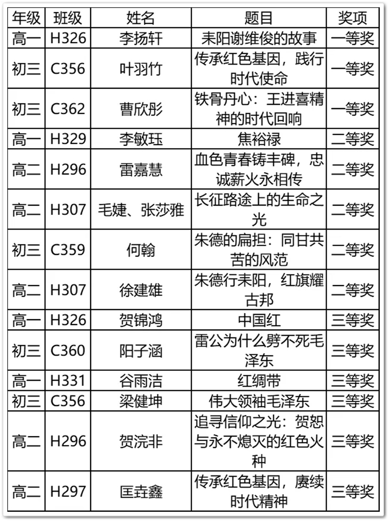 比赛特邀初中部语文老师担任评委。评委组从内容思想、语言表达、情感渲染等方面进行综合评分,最终评选出一等奖3名、二等奖5名、三等奖7名等多项荣誉。党支部副书记周文根老师在总结中高度赞扬活动意义:“同学们用青春视角解读红色历史,让教科书中的英雄人物‘活’了起来,这是一堂生动的思政课!”