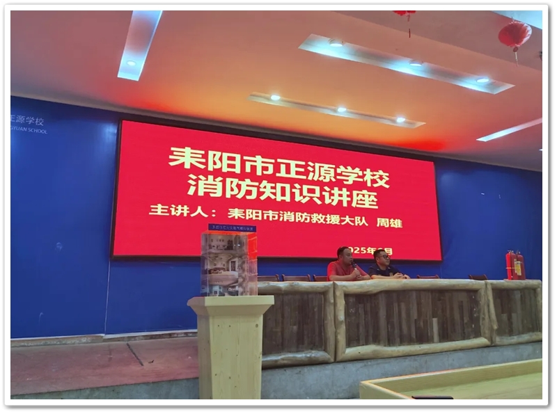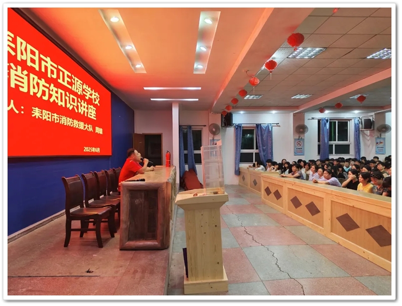 6 月 12 日,耒阳市消防支队官兵走进正源学校,在学校报告厅为师生开展消防安全知识培训讲座,现场生活老师熟练的灭火器操作演示,赢得了消防教官的高度称赞。