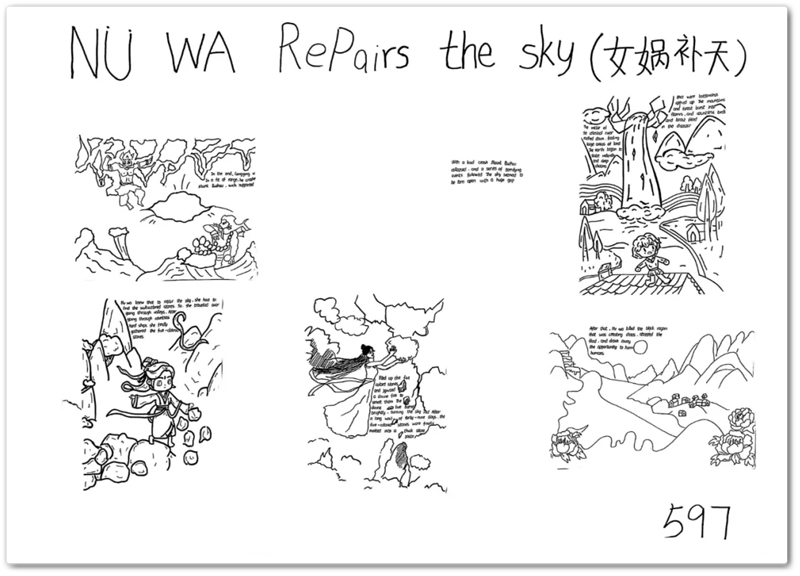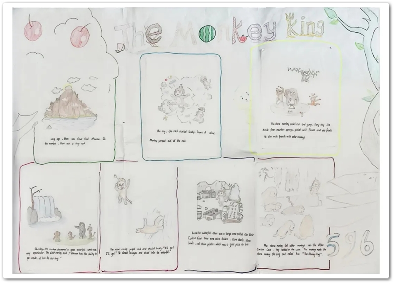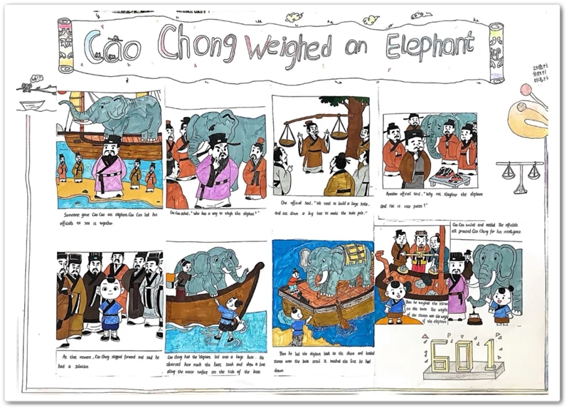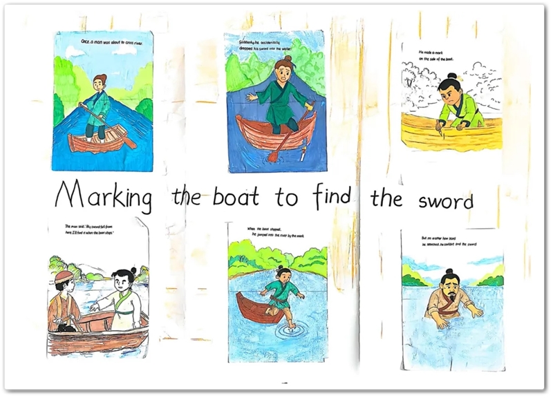 活动前期,初一年级31 个班级通过抽签的方式选取了本班所讲述的中国传统故事,如《精卫填海》《愚公移山》《桃园三结义》等。随后同学们便利用课余时间,精心制作本班的绘本。在制作过程中,同学们充分发挥自己的想象力和创造力,用手中的画笔描绘出一个个生动的故事场景,用英语书写出一个个精彩的故事文本。每一本绘本都凝聚着同学们的心血和智慧,展现了他们对传统文化的理解和热爱。
