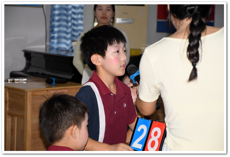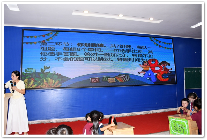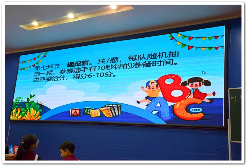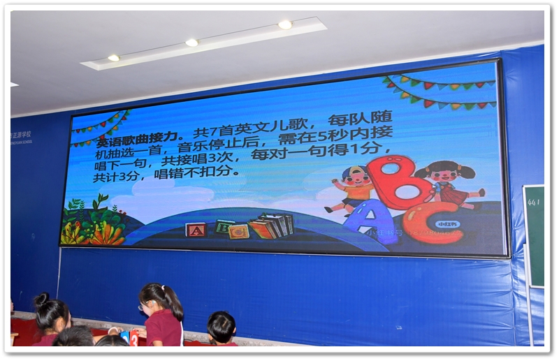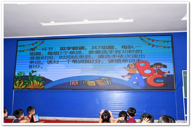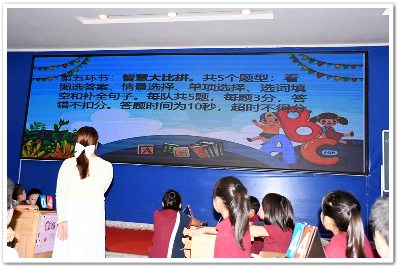 5. Battle of Wits 智慧大比拼:此环节分为五个部分:看图选答案、情景选择、单项选择、选词填空和补全句子。涉及的所有题目都是课文内所学过的知识,考验同学们对所学课文和单词的熟练和掌握程度。答题节奏快,紧张刺激,气氛高涨。