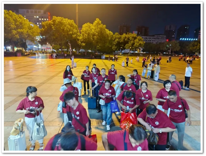 八月的晚风裹挟着暑期的热情。8月9日晚7:30,校广场一片绚烂的红云在朝阳下跃动——116名身着统一大红旅行服的职工们神采飞扬,如一团团跃动的火焰,点燃了启程的欢腾。