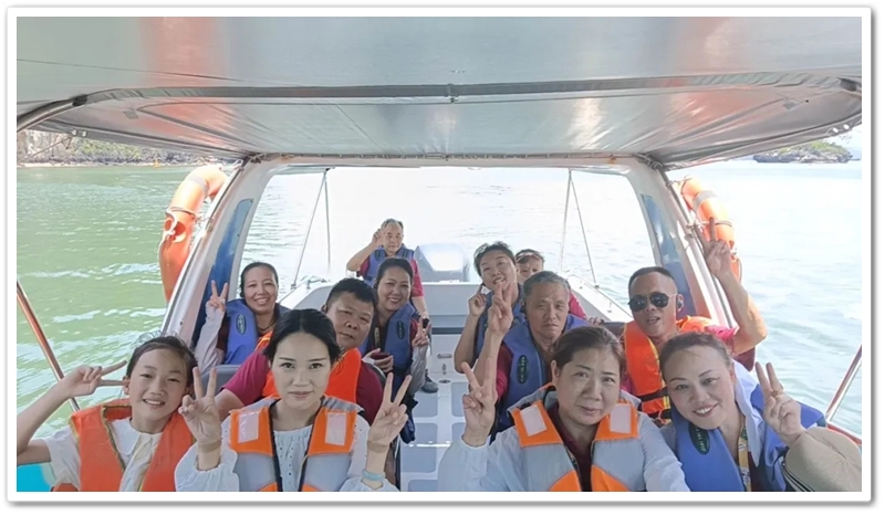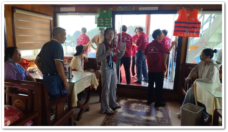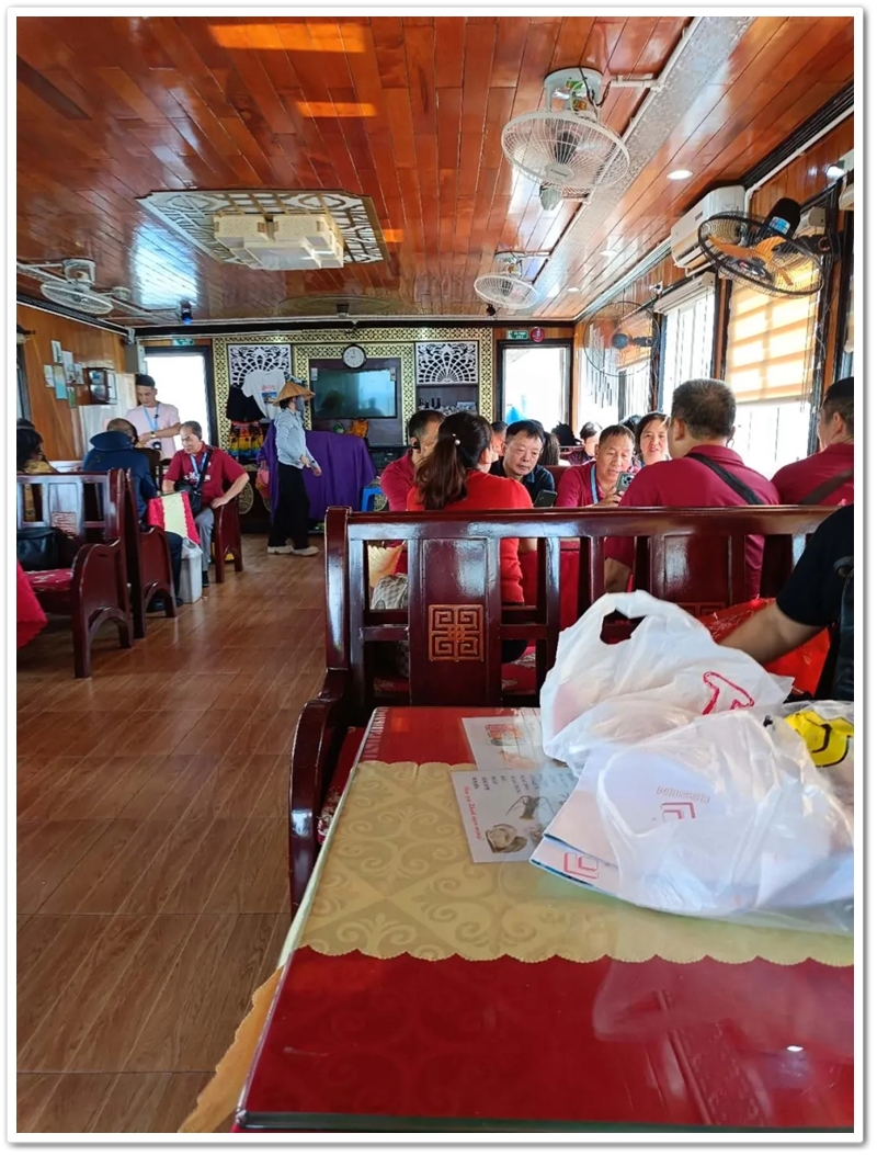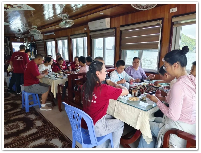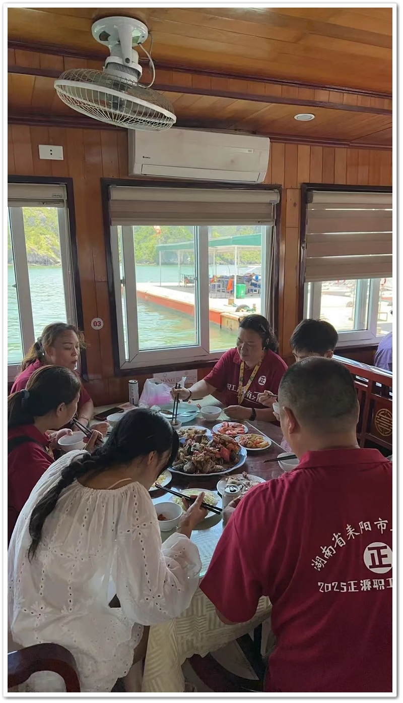 8:00整,三辆大巴载着116位满怀期待的“正源人”,奔赴下龙湾仙境。登上游船,碧波万顷托起奇崛峰林,海天相接处浑然难辨。快门频闪,欢声笑语,将天地壮阔定格成永恒记忆。游船破浪前行,驶近鬼斧神工的斗鸡山、幽深的仙境迷宫与傲然挺立的大拇指峰,满船惊叹骤然沸腾!大家兴致勃勃地换乘快艇和小船,向海湾深处探秘。浪涌之间,偶遇当地渔舟兜售生猛海鲜,众人争相挑选,托付船家烹制。