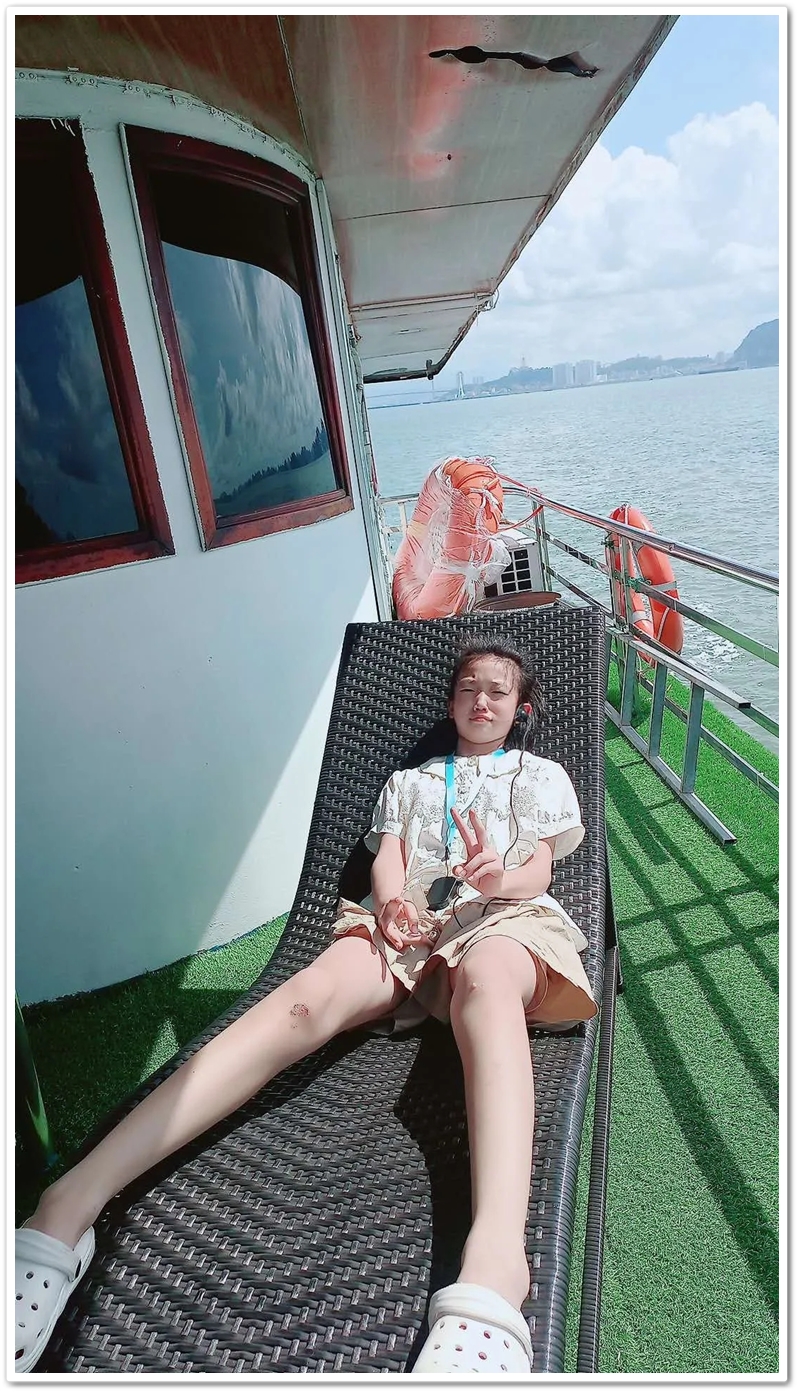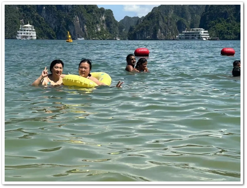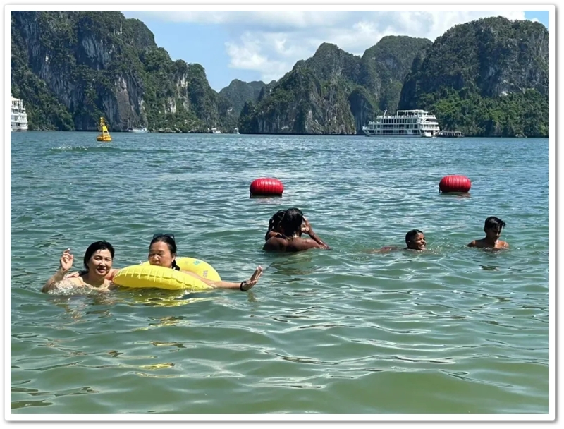 餐后,游船直抵天堂岛。望见那片澄澈蔚蓝,众人难抑兴奋:“大海,我们来了!”沙滩瞬间跃动起欢腾的身影。有人纵情投入浪花怀抱,有人嬉闹追逐于细沙之上;更有勇者不畏高,沿石阶奋力登顶。立于高处豁然开朗,俯瞰碧水环绕、千峰竞秀,下龙湾壮景如诗如画铺展眼前。下山途中偶遇异国游人,英语教师Miss He主动攀谈。快门轻按,瞬间绽放的国际友谊之花,为旅程再添温情。