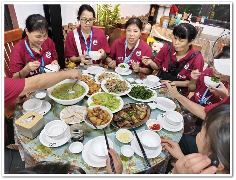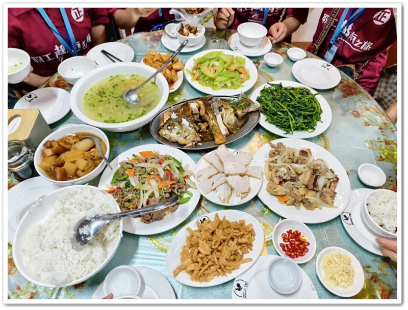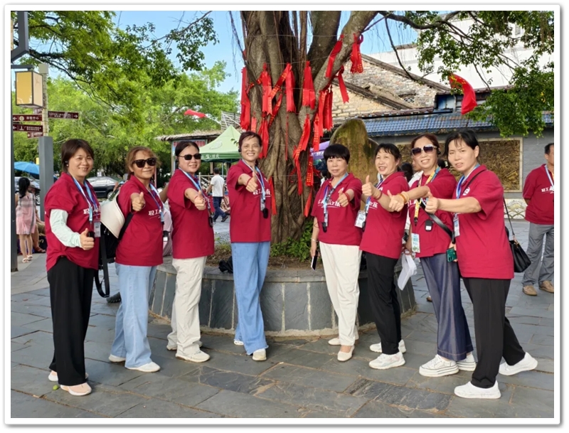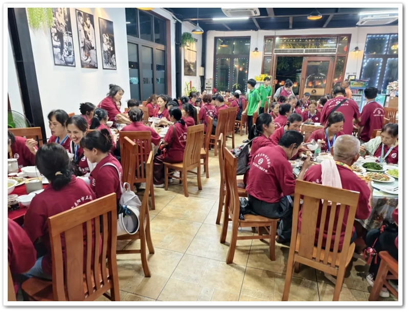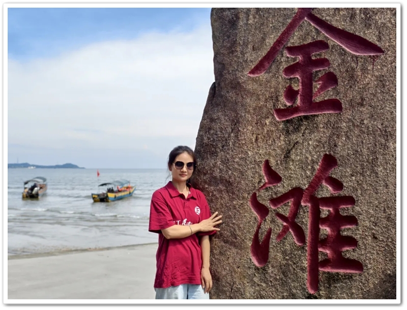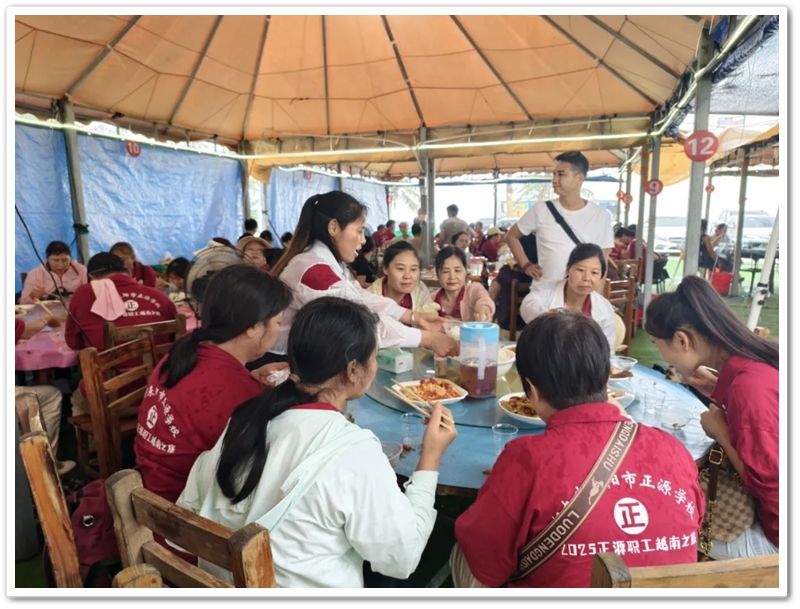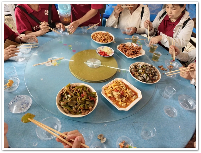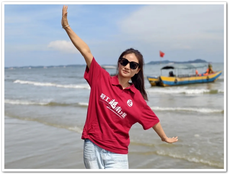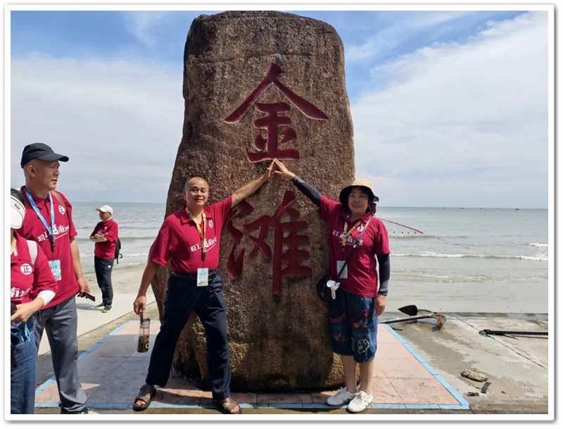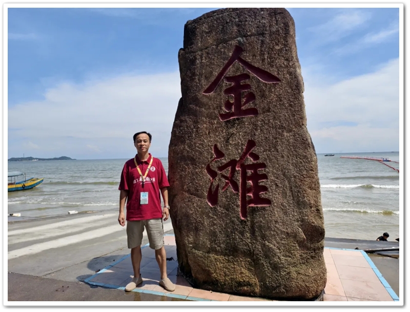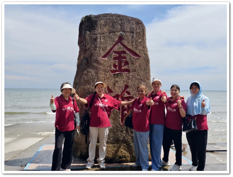 下午两点十分,旅游车停在东兴市万尾金滩边的餐馆前。刚推开车门,海风裹着海鲜的咸香扑面而来,餐馆老板系着油亮的围裙在门口迎客:“刚出锅的虾婆,要不要先尝两只?”餐桌上,麻婆豆腐的红油泛着亮光,素炒白菜带着清甜,香煎鸡尾虾的壳脆得能嚼出声响。一位生活老师夹起一只虾,边剥壳边说:“这虾比咱们菜市场的鲜多了,回头得带点干货。”平时大家吃饭较早,而今天到下午两点才开餐,看到满桌的特色佳肴,大家早已垂涎三尺,迫不及待,一个个津津有味地咀嚼着,有些同志不到十分钟就用餐完毕。先吃完的几个女同志迅速走到海边那块刻有“金滩”字样的石碑前,摆出各自认为最美的造型,让同伴帮他们用手机拍下了美好的回忆。见女同志争先恐后留影,男员工也跃跃欲试。旅游总领队蒋智敏助理见大家兴致颇浓,连忙掏出手机,用他专业的摄影水准帮各位职工定格下了此刻的美好。单照过后,总领队蒋又招呼大家聚在“金滩”石碑周围,给我们的团队留下了今天的第一张大合影。