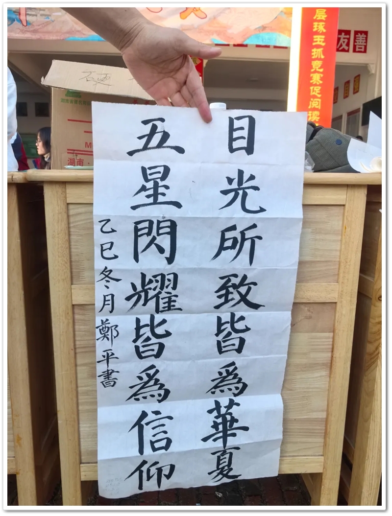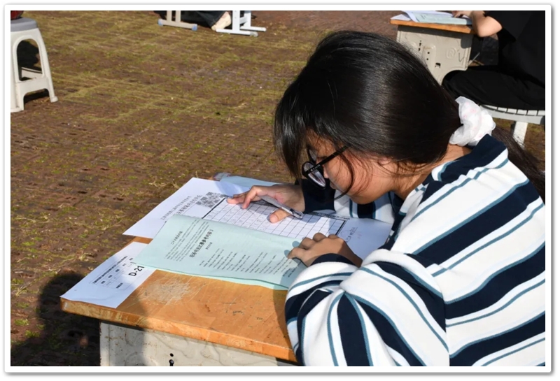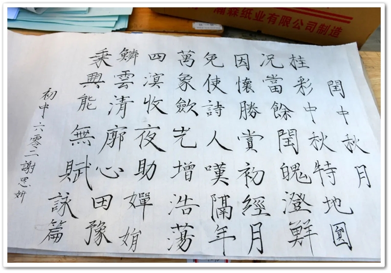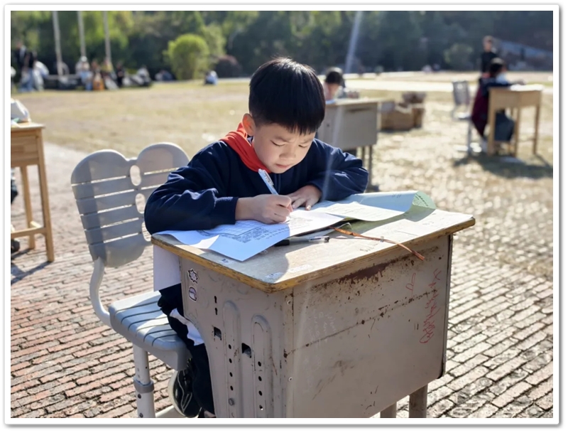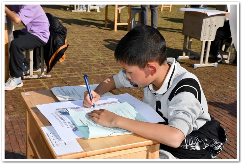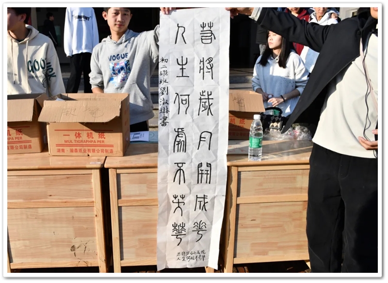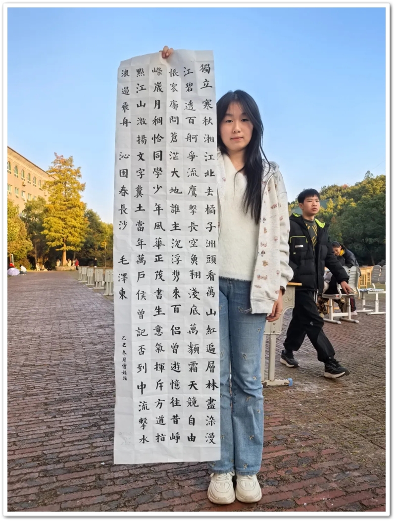 书法赛区内,毛笔黑润含香,硬笔沙沙作响,参赛学子奋笔疾书。楷行草隶篆各展风姿,颜柳欧赵褚流派纷呈,笔锋流转间尽显功底;罗含颂、正源赞等佳作,毛泽东诗词、习近平金句等等跃然纸上,洋洋洒洒间意气风发,笔走游龙处翰墨飘香。或是每日新闻联播时政学习的熏陶,或是建校二十年薪火奋进的鼓舞,“抗战胜利载史册,民族复兴展现宏图”、“三十功名尘与土,八千里路云和月”、“孩儿立志出乡关,学不成名誓不还”、“不畏浮云遮望眼,自缘身在最高层”等慷慨激昂的豪情壮志更是频频在学子们笔尖流淌。