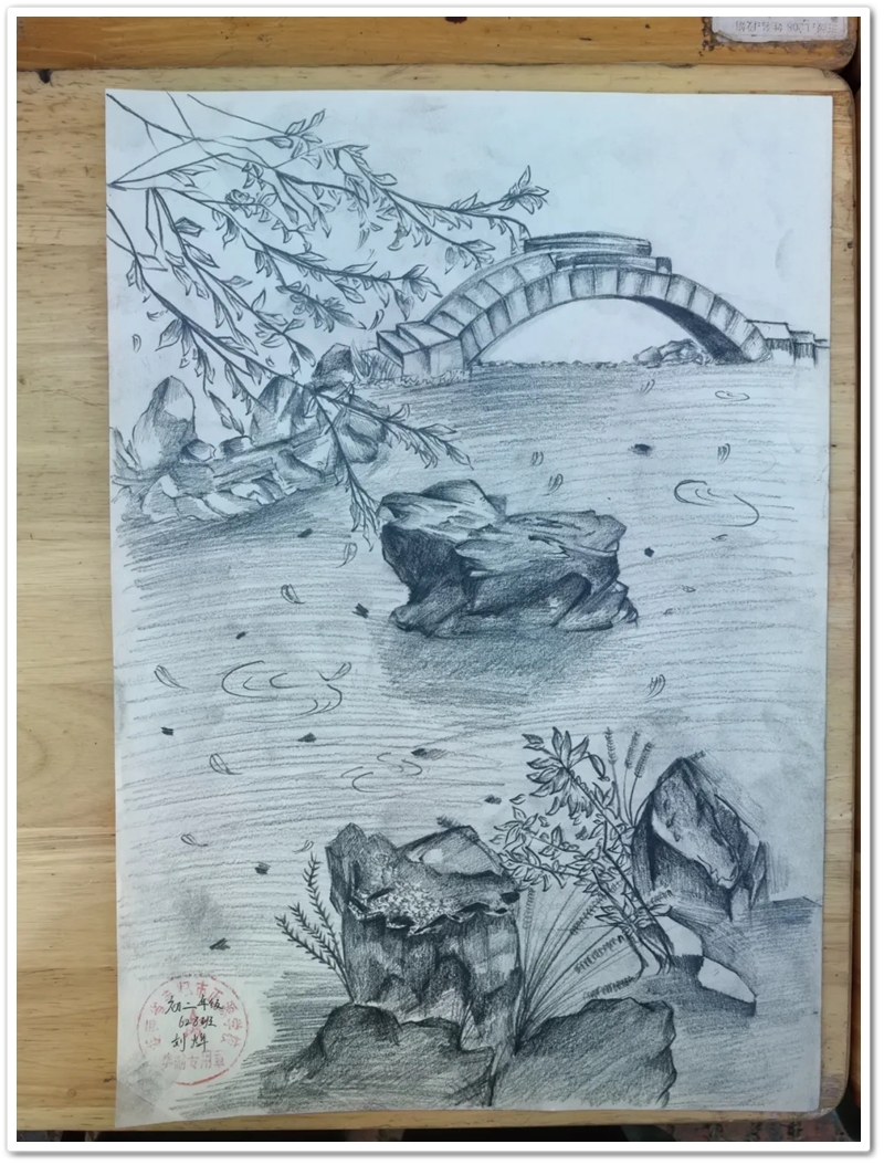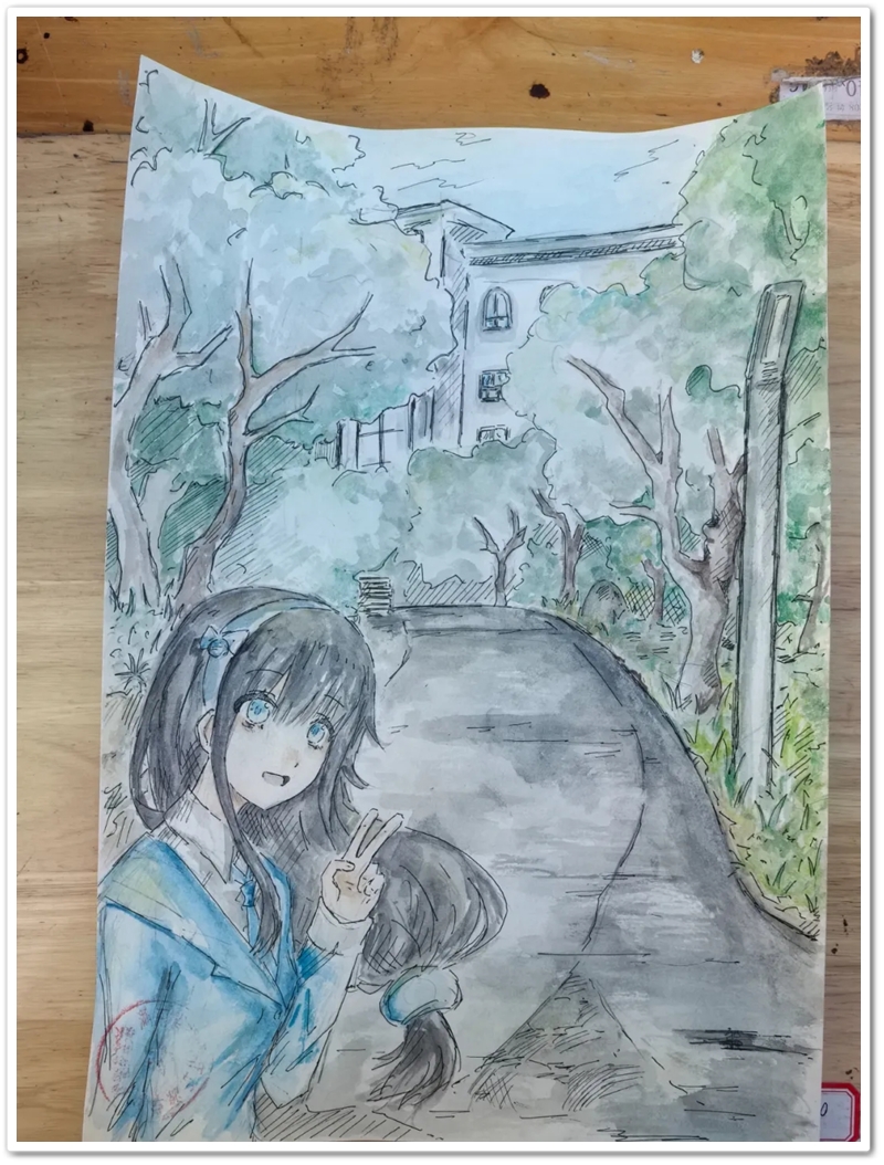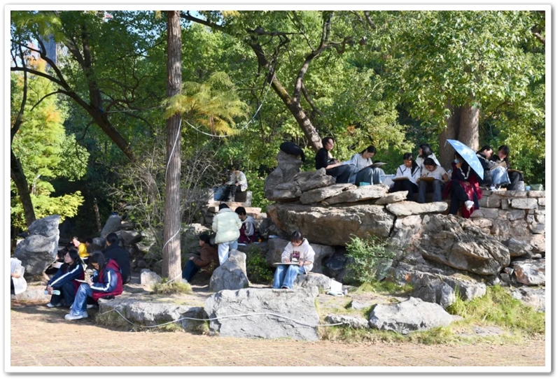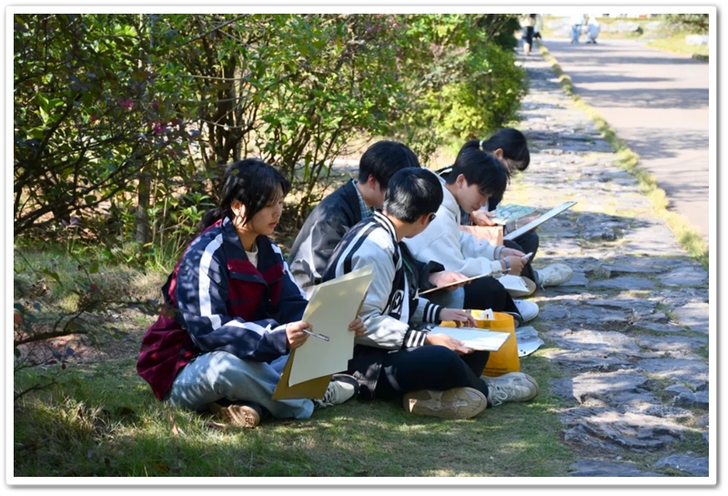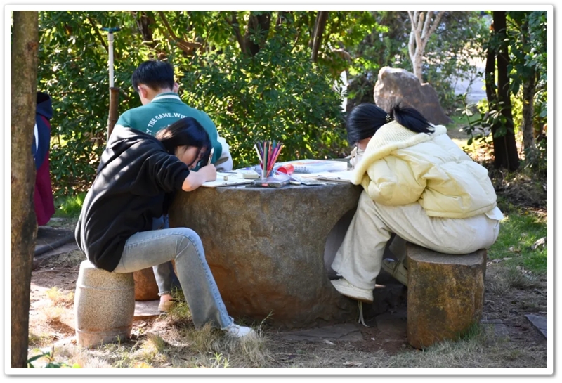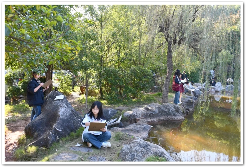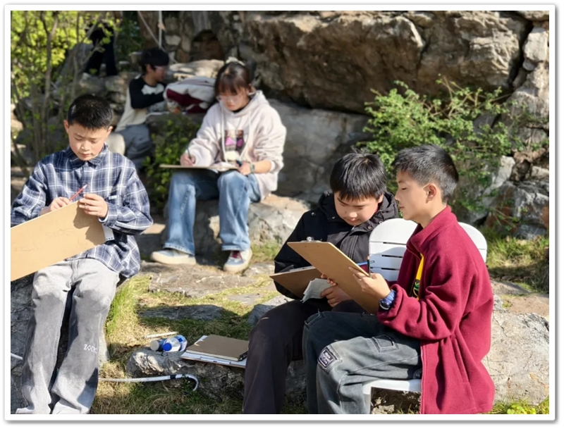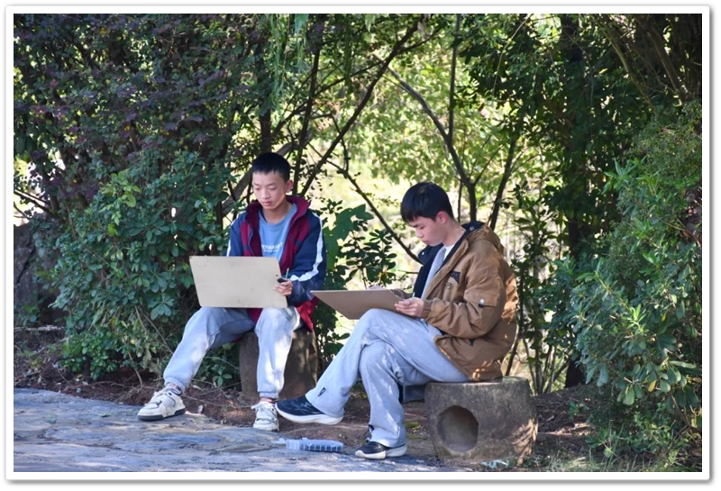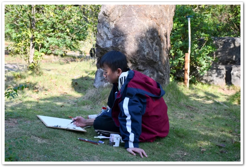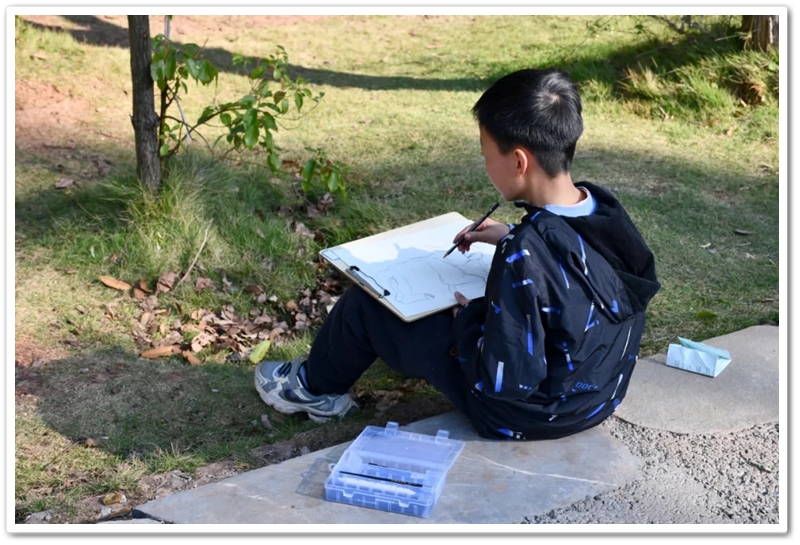 绘画赛区则依山就势、顺其自然,同学们如同平日户外写生课一般,分散在广场东南西北各个角落。池塘边、树荫下、假山上、石桌旁、花丛中,处处可见他们专注创作的身影,画笔翻飞间灵感迸发。素描的细腻、水彩的灵动、水粉的厚重,各类画作琳琅满目;校园风景、课堂瞬间、航空遐想等题材丰富多元,卡通风格、速写纪实、科幻创意等画风各显神通。提质改造的校园环境更具诗情画意,星罗棋布的画夹愈发五彩缤纷,正源孩子们尽情挥洒着他们独有的内心钟爱与无限创意。