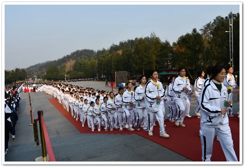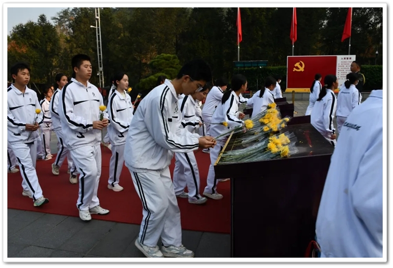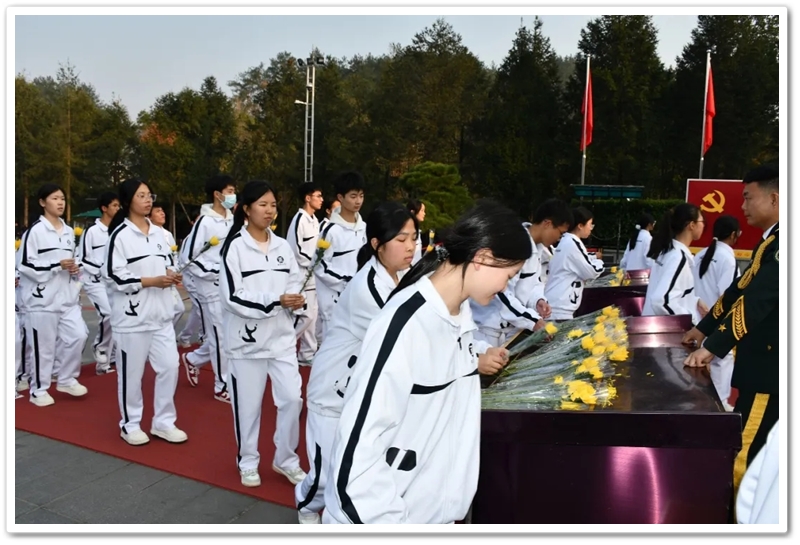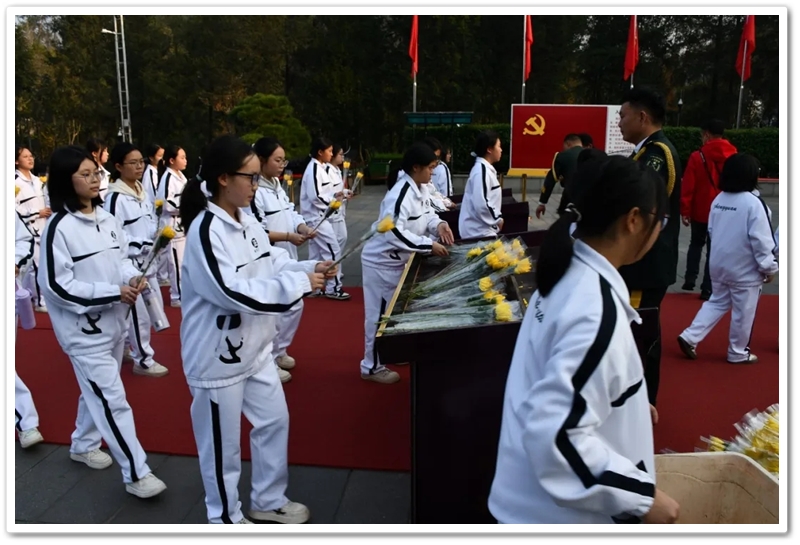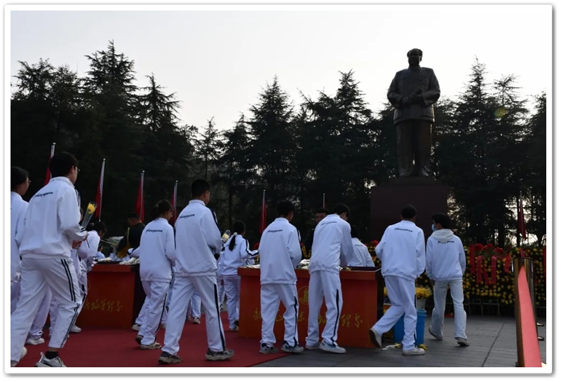 在深情的《献花曲》中,学生代表稳稳抬起花篮,缓步走向铜像基座,敬献上全体师生的崇高敬意。随后,同学们手持象征思念与崇敬的黄色菊花,依次有序上前,深深鞠躬,将鲜花轻放于铜像前。阳光正烈,汗水悄然滑落,但无人顾及。许多同学在献花时久久凝视着伟人慈祥而深邃的目光,思绪万千。他们或许想到了开国大典上那声震撼世界的庄严宣告,或许想到了“敢教日月换新天”的豪迈气概,更思考着自身与这个伟大时代、与这份厚重历史遗产的融合。那一束束菊花,汇聚成一片金色的海洋,是后辈对先辈的礼赞,更是青春对信仰的崇拜。