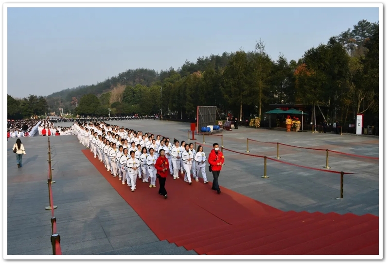 下午3时,全体师生整齐列队,怀着无比崇敬的心情,步入庄严肃穆的毛泽东广场。金色的阳光倾洒在广场的每一寸土地上,映照在广场中央的毛泽东同志铜像上,熠熠生辉。伟人精神穿越时空,温暖和煦,照耀着每一个缅怀者,每一个赓续传承者。