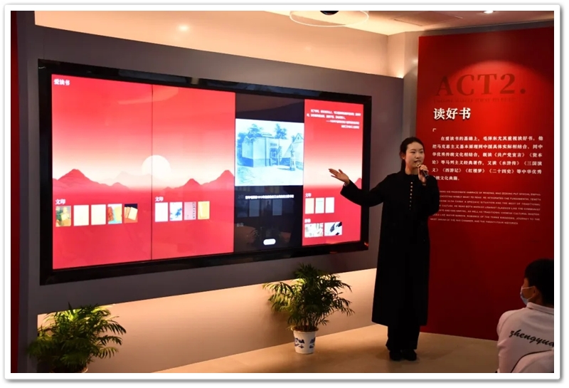 我们从“韶山少年”毛泽东的足迹开启探索,一个心怀天下、不甘平凡的乡村少年形象跃然眼前;我们跟随青年毛泽东辗转求学,“目睹”了他面对世界地图,凝神思索,体悟了他胸怀寰宇,立志探索救国真理……讲解员娓娓道来:毛泽东傲立时代潮头,反复求索实践,最终寻得马克思主义真理,立志改造中国与世界……一步步人生的脚印、一回回思想的蜕变、一次次历史关头的挺膺担当,都生动地呈现在我们的眼前,都直接叩击着我们的心灵。