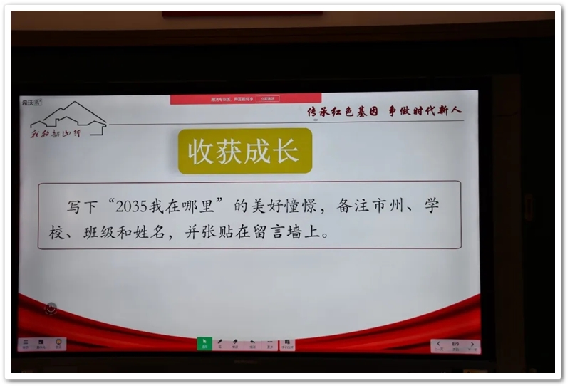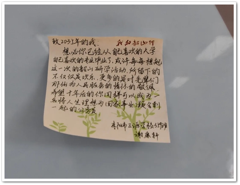最后,同学们在便签上写下“2035年我在哪里”的留言,整齐张贴在教室后面的黑板上。在学习笔记上写出对研学的感受,对学习的总结,对未来的期待。他们此刻心中必然明了,传承不是空洞的口号,而是需要内化于心、外化于行的自觉行动;担当不是遥远的未来,而是始于当下、见于细微的实际作为,梦想不是虚妄的企图,而是无畏险阻、奋勇争先的坚定足迹。