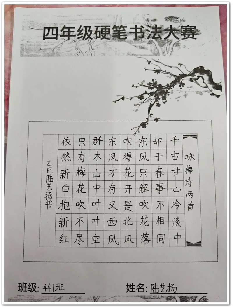 监考老师们穿梭在课桌间,目光里满是欣慰。谢老师看着441班同学们笔下渐渐成型的作品,轻声感慨:“孩子们的进步太明显了,从握笔姿势到笔画结构,都越来越规范了。”