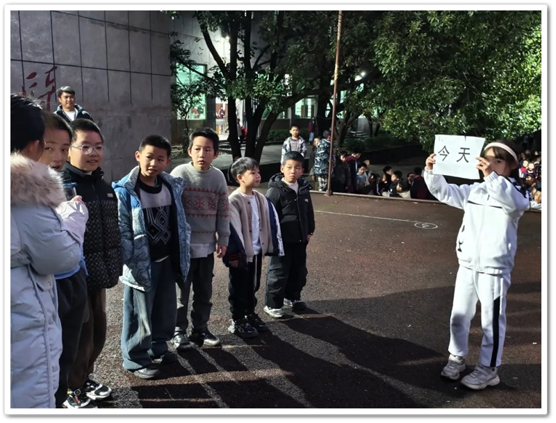第二环节是邓晶老师主持的语文闯关节目“词语接龙”。“今天!”“天空!”“空气!”……随着邓老师报出“今天”、“学校”、“炫彩”、“笑声”等起始词语,孩子们的小手如雨后春笋般高高举起。一位帅气的男生反应飞快,“笑声”刚落,他立刻接出“声音”;可他旁边的队友一时卡壳,挠着头思索片刻,脱口而出“音乐”,瞬间赢得满堂喝彩。经过几轮比拼,四年级444班的李钰菱,廖智浩棋高一着,赢下比赛。在这场趣味比拼中,孩子们不仅夯实了语文基础,更展现出敏捷的应变能力。