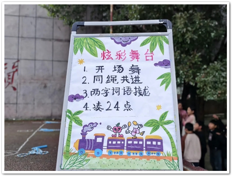 第一环节的体育游戏“同绳共进”由肖文敏老师组织。一声哨响,参赛的孩子们迅速肩并肩站成一排,将长长的跳绳紧紧握在手中。二年级478班黄智慧喊着响亮的节拍:“一二!一二!”带领贺靖雯步调一致向前跃动;一年级486班徐子晨脚下不小心踉跄,却立刻稳住身形跟上节奏,引得队友大声鼓劲,呐喊声、加油声、欢笑声交织在一起,成了校园里最动听的旋律。最终,五年级423班的曹丽妍和欧阳雨橙胜出,喜获奖品。