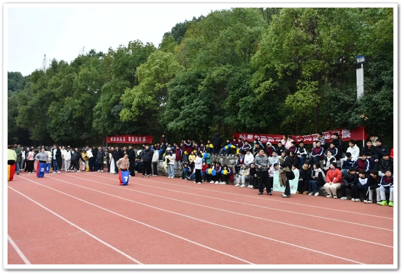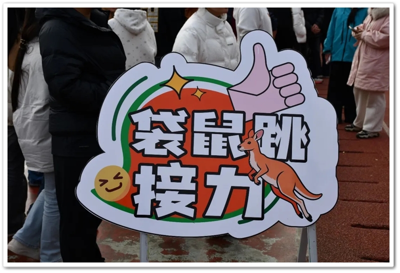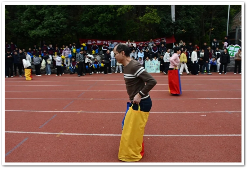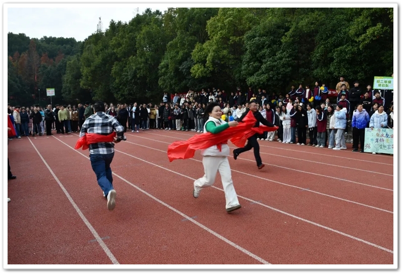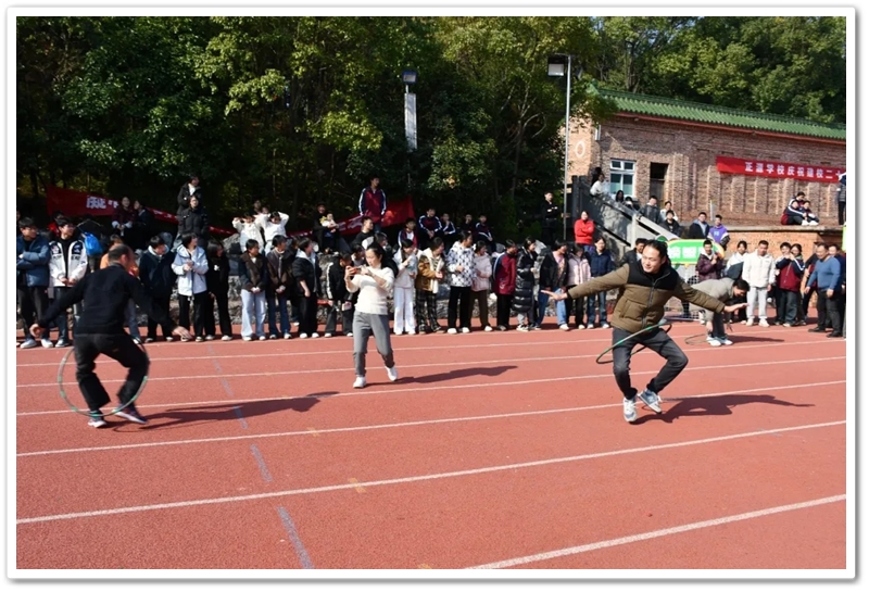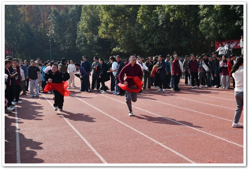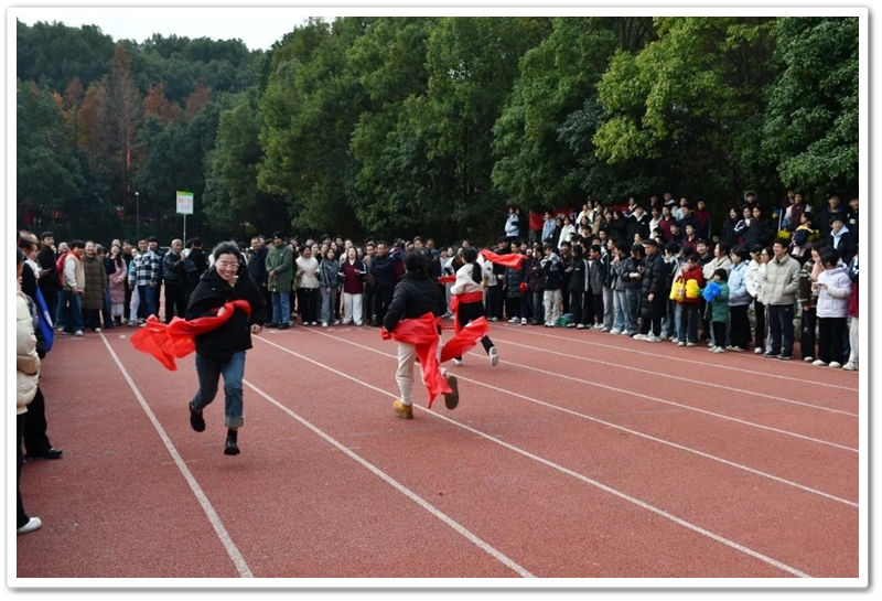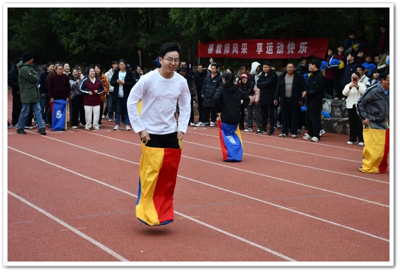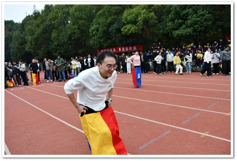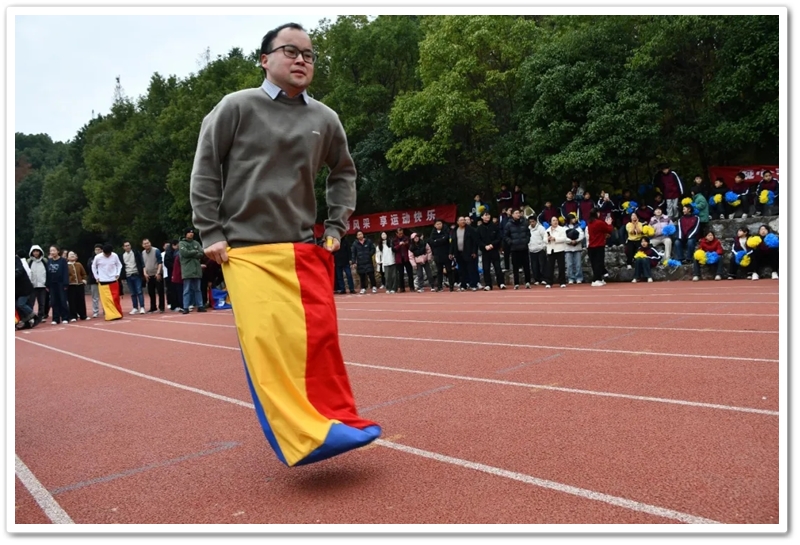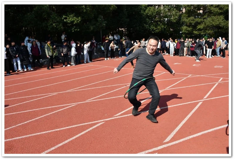赛场上,各项趣味项目亮点纷呈、妙趣横生。“精准套圈王”既要眼准手稳,还要一点运气加成。老师们屏气凝神瞄准目标,每一次套中总要引发一场欢呼雀跃,实力与运气的碰撞让赛场氛围瞬间升温。“袋鼠跳”项目中,老师们身着布袋、手脚协同,找准节奏方能游刃有余,蹦蹦跳跳飞速前行。“摸石头过河”项目则将难度拉满,踩着道具石块稳步挪进,稍有不慎便会趔趄失衡,一个“连滚带爬”,引发全场欢笑;“腰缠万贯”项目考验着团队间的默契配合,一不小心就要撞个满怀;“螃蟹跑”项目要双腿顶着呼啦圈侧身前行,老师们手忙脚乱的姿态与奋力冲刺的模样形成鲜明反差,又让众人忍俊不禁……掌声与欢笑交织,运动场内俨然化作一片欢乐的海洋。