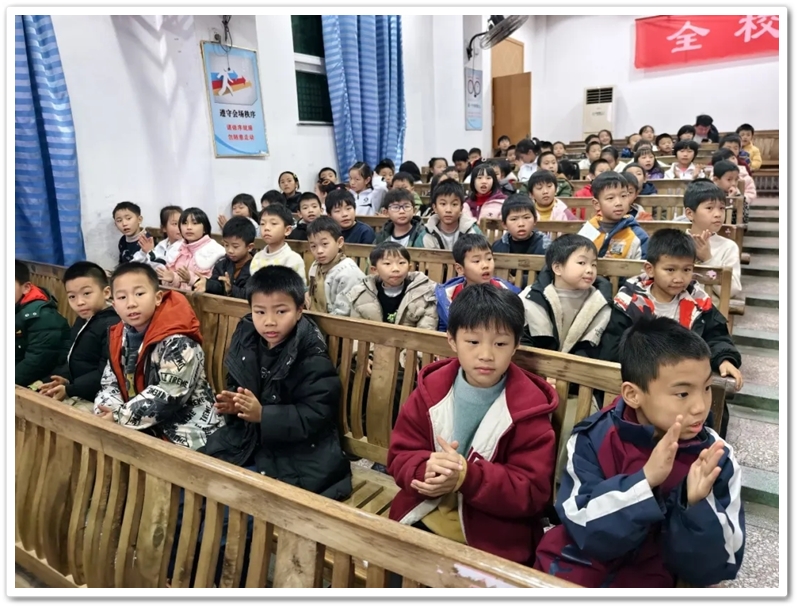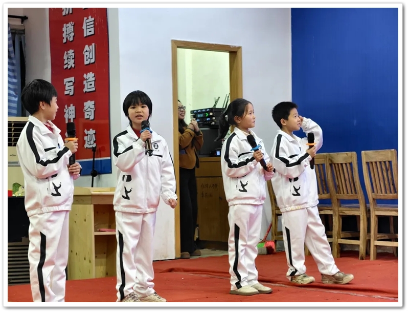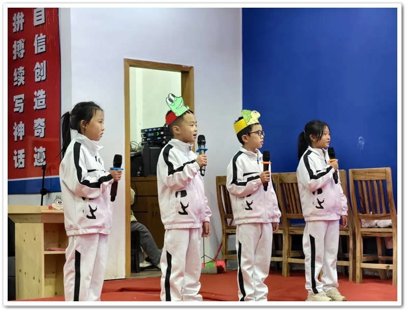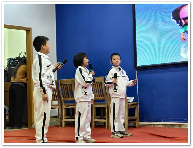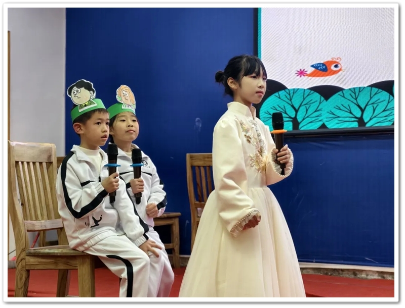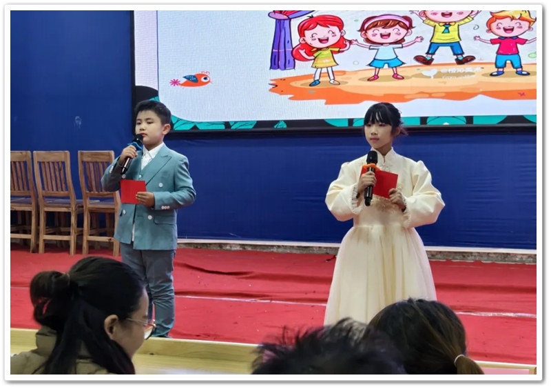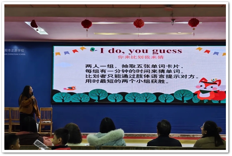 第二,游戏环节:你“划”我猜。为了消除观众和评委的些许疲劳,“你来比划我来猜”互动游戏环节欢乐开启,瞬间将现场的热烈氛围推向新的高潮。本次游戏特意结合三年级英语学习内容,涵盖了动物、文具等孩子们熟悉的词汇。游戏以小组为单位展开,每组由两名同学搭档协作。比划的同学使出浑身解数,借助简单的肢体动作提示单词特征;猜词的同学则凝神倾听、快速反应,时而眉头紧锁认真思索,时而灵光一闪脱口而出。台下的观众们也化身“场外智囊团”,跟着台上的节奏紧张不已,时不时高声喊出自己的答案,欢呼声、加油声、欢笑声交织在一起,回荡在整个活动现场。这个充满趣味的小游戏,不仅考验了同学们的默契配合,更让大家在轻松愉悦的氛围中巩固了英语知识,真正实现了“玩中学、学中乐”。