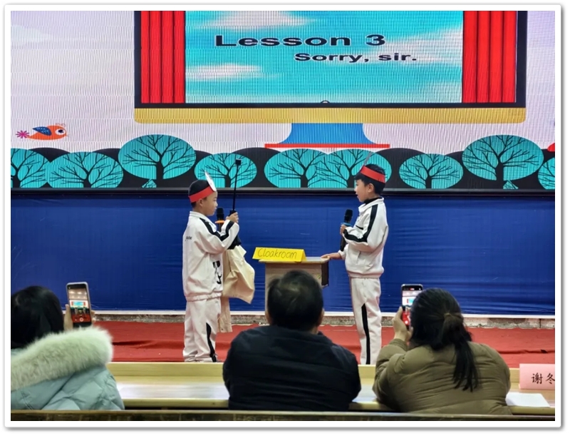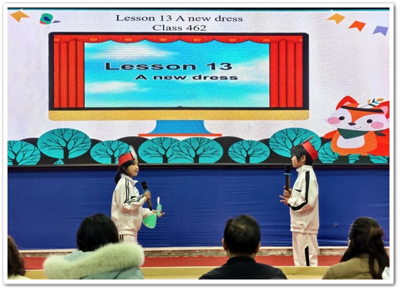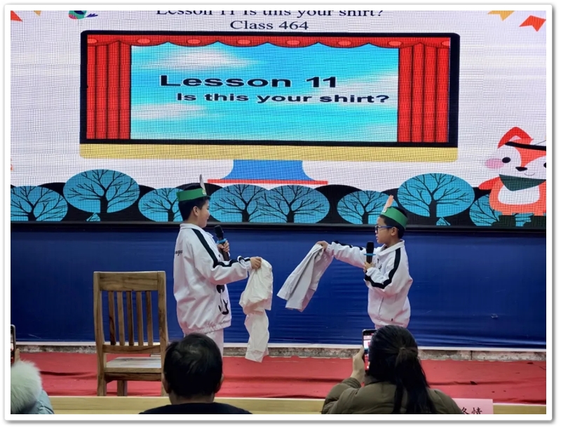 460班带来课本第三课Sorry, sir 的演绎,发音标准,自然流畅;464班第11课的表演准备充分,道具精美,生动传神;第19课课文长且难,然而463班表演声情并茂,惟妙惟肖;461班带来第九课How are you today? 的演绎,自信大方,活灵活现;462班第13课的表演富有童趣,表现亮眼。
