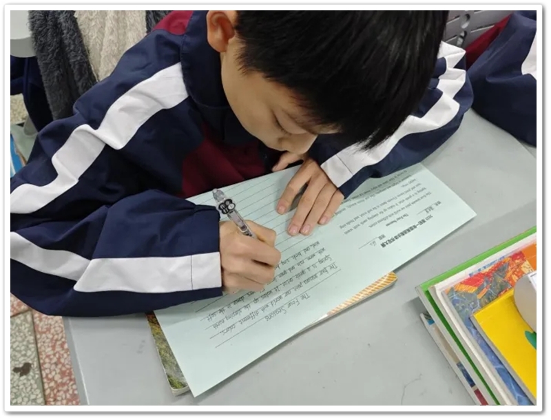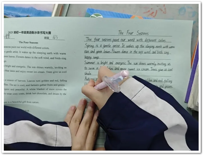 比赛现场,墨香依稀,笔尖轻舞。同学们坐姿端正,神情专注。用心书写每一个字母、每一个单词、每一个句子。一纸素笺之上,字母圆润饱满,间距匀称有致;单词连贯流畅,行文整齐如列。起承转合间,是日复一日练习的沉淀;横平竖直里,藏着一丝不苟的态度。笔尖在纸上流畅滑动,展现出了扎实的书写基本功。衡水体以其清晰、工整、易读的特点,成为同学们展现英语书写能力的最佳载体。在孩子们的笔下缓缓绽放,每一份作品都仿佛被赋予了沉静的生命力。