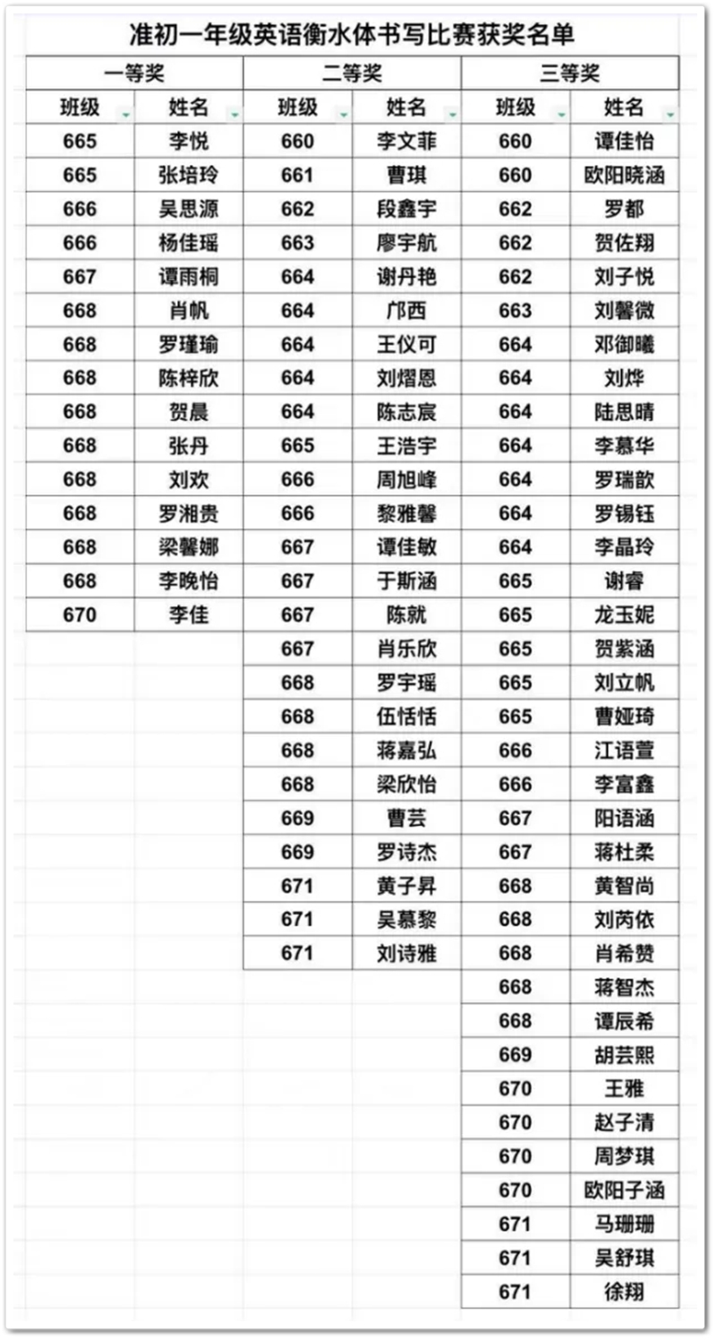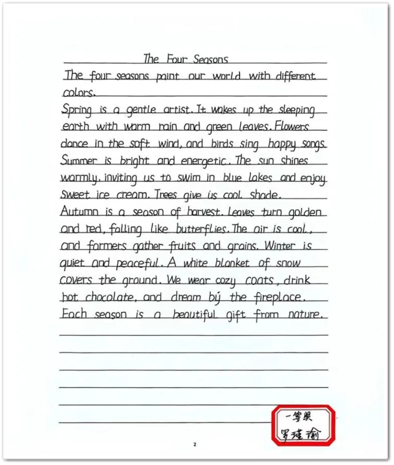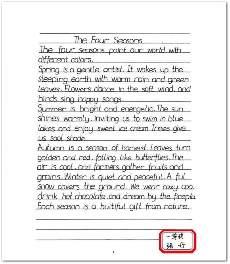 经过评委老师从字形规范、卷面整洁、整体布局等多方面的细致评选,最终涌现出一批优异的书写作品。这些作品不仅展现了扎实的书写功底,更体现了同学们追求卓越的认真品格。部分优秀作品将于校园文化长廊集中展示,成为一道启迪后学的亮丽风景。经过公平、公正的评选,最终评选出一等奖15名,二等奖25名,三等奖15名。获奖作品笔画流畅、结构匀称、卷面整洁,充分展现了六年级学生良好的英语书写风貌。