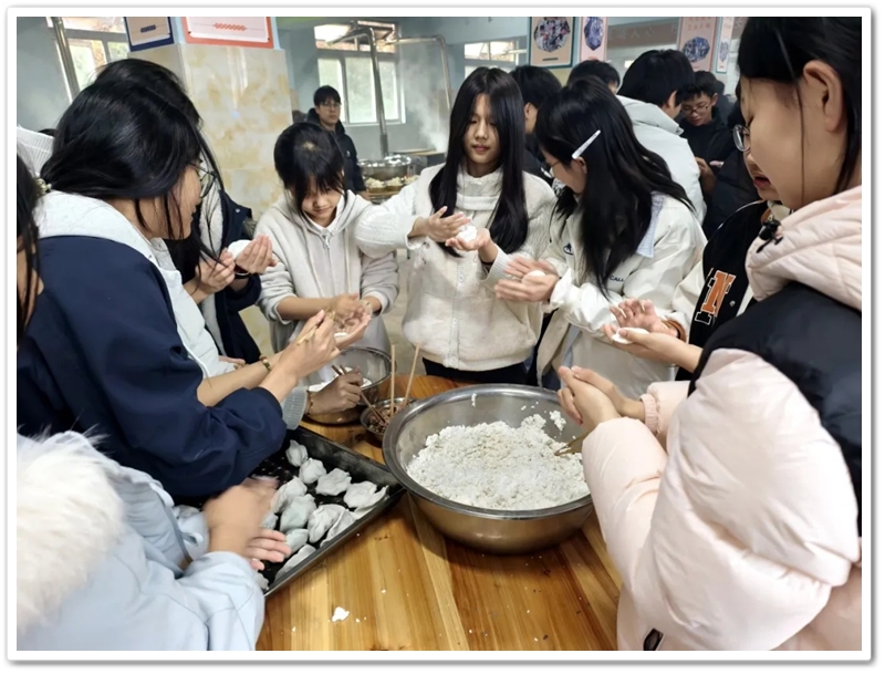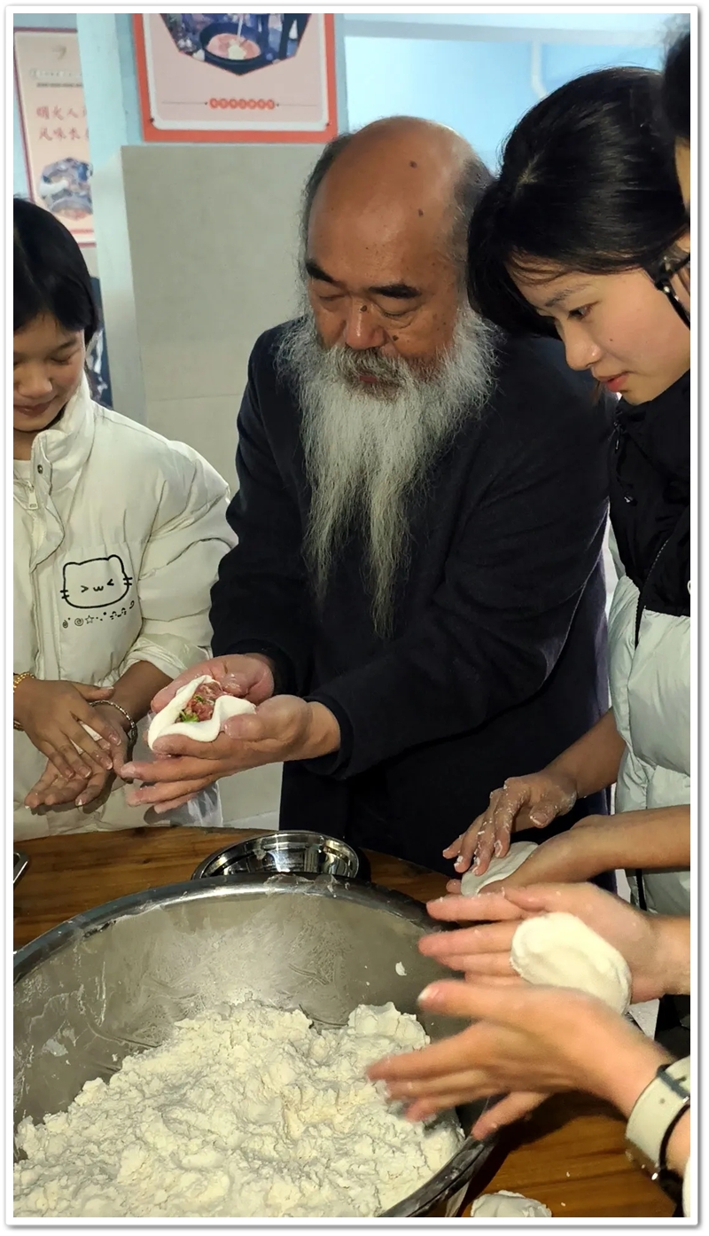 第一堂烹饪课,罗校长给同学们带来了太平圩的乡土特色美食“包粑粒”。大米磨粉,清水揉拌,团成一个大大的剂子,掌心拍拍,压成厚厚一片,包上葱拌鲜肉馅,再轻轻折一折,裹一裹,一个拳头大的大号“米饺子”大功告成。