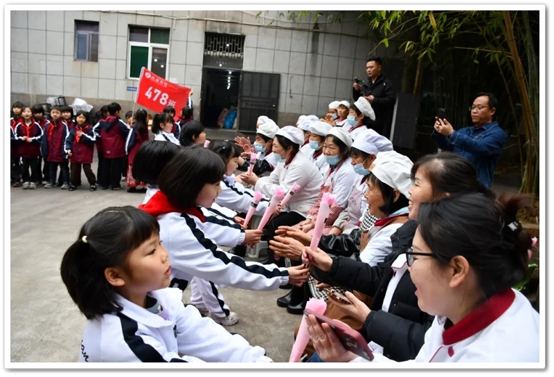 3月16日上午,一、二年级的孩子们化身“小小感恩使者”,将目光投向了默默付出的食堂叔叔阿姨。小朋友们穿戴整齐,手里攥着亲手绘制的彩色卡片,卡片上画着热气腾腾的饭菜、戴着白帽子的阿姨,还有歪歪扭扭的“谢谢阿姨”四个字,小脸上满是郑重与期待。她们来到了食堂叔叔阿姨身边,向她们表达祝福与感谢。