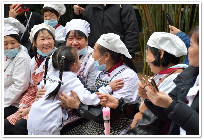 话音刚落,孩子张开双臂,扑进阿姨的怀里——小小的脑袋埋在熟悉的围裙上,软软的小手紧紧环住阿姨的腰。几位常年在窗口打饭的阿姨,一边轻轻摸着孩子们的头,一边抬手拭去眼角滑落的泪水,脸上却漾着藏不住的笑意。镜头里,一张张挂满泪痕却满是温柔的脸,一个个紧紧相拥的身影,让感恩的温度在春日里无限蔓延。