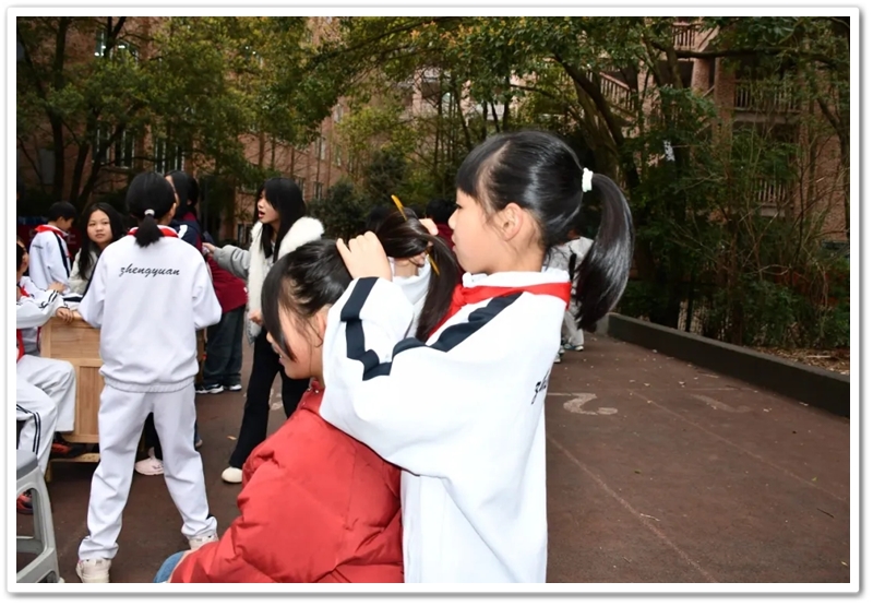 生活服务:帮低年级小朋友梳理凌乱的小辫子、系好松开的鞋带、整理褶皱的衣物,用细致的照料守护同伴。