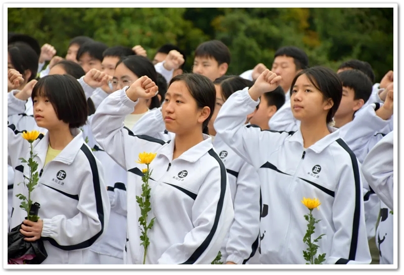 学生代表上台发言,表达了立志成才、报效祖国的坚定决心。随后,全体学生庄严宣誓:“缅怀革命先烈,传承英雄精神;铭记历史使命,珍惜幸福生活;勤奋刻苦学习,锤炼高尚品格;强健身心体魄,勇担时代重任;立志成才,报效祖国;为实现中华民族伟大复兴贡献力量!”铿锵有力的誓言,响彻陵园上空,彰显了新时代正源学子的责任与担当。