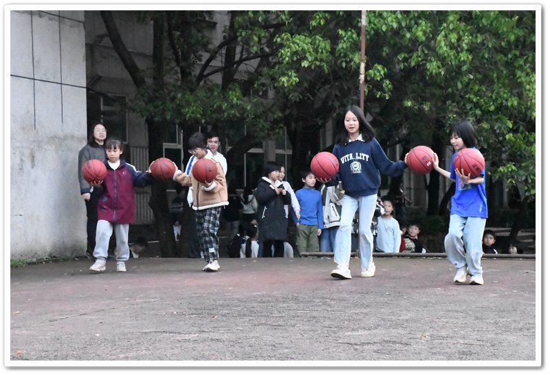 活动伊始,第一个游戏《齐心协力》率先点燃全场热情。该游戏以团队协作为核心,考验着参与者的默契与配合,参与者们两两一组,每人一只手单手拿着一个篮球,另外一只手,两人合作支撑一个篮球,两人三球,齐心协力将篮球运过障碍物后折回,篮球不落地最先到达的小组获胜。赛场上,同学们分成若干小组,每组成员都紧密配合,有的小组步伐稳健,如同训练有素的队伍,匀速向前推进;有的小组则节奏稍显慌乱,手臂间的配合偶尔出现偏差,引得周围观众发出阵阵善意的笑声。