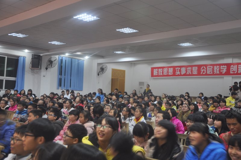 12月12日晚上,初二年级的廖燕、刘璇、王晗芝等老师,在学校报告厅为来自初一年级的300名学生、初二年级、准高一年级、高一年级的若干名慕名而来的学生呈现了一堂英语盛宴。其中廖燕老师主讲的“如何正确使用交际用语”,分三部分,为学生陈述了中西文化差异下,中国学生如何正确用英语自如交流。游戏环节将活动推向高涨,同学们积极参与的激情正恰恰印证了我们社团的口号“Enjoy English, Enjoy life!”。活动后,学生们踊跃报名参加我们的社团,并感叹此次活动受益匪浅。