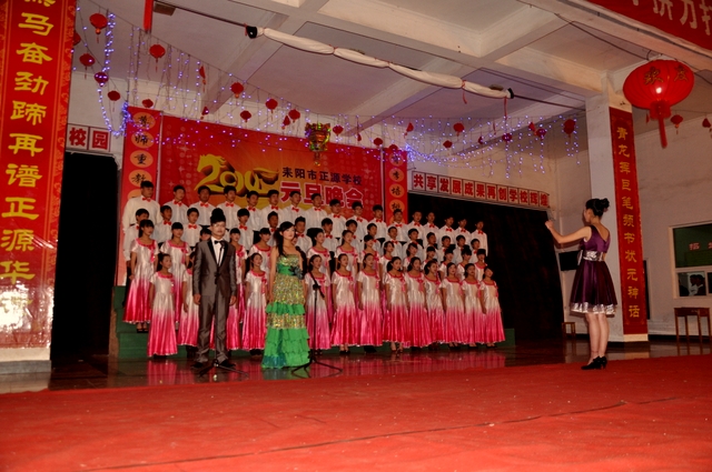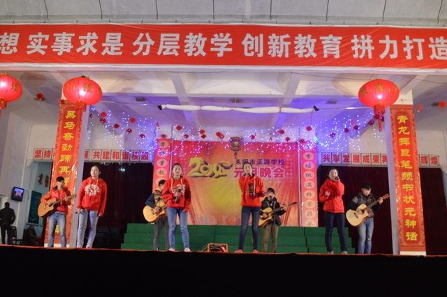 教学楼大厅上方,一条“解放思想,实事求是,分层教学,创新教育,拼力打造三湘一流名校”的巨大横幅特别引人注目,横幅下面均匀悬挂了四盏大红灯笼,大厅两侧“青龙挥巨笔频书状元神话 黑马奋劲蹄再谱正源华章”的对联表达着正源人的成就感和豪迈激情。大厅中央背景布上的“2014”四个艺术字造型成一匹奔腾的骏马,既体现出即将到来的一年按十二生肖属于马年,更象征着正源人在新的一年里会像一匹黑色的骏马,一往无前,马到成功,取得不断令人刮目相看的成就。
