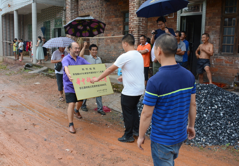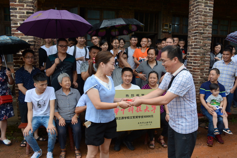 罗校长一行刚进村口,迎宾人员即刻点燃了喜炮,以传统的方式迎接正源师生的到来。罗校长亲自为吴海峰 授予奖牌,毛书记为吴海峰母亲颁发了一万元文军奖学金,热烈祝贺吴海峰同学以647分优异成绩考取了华中科技 大学。