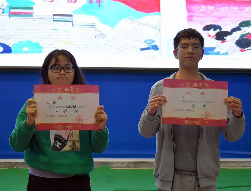 现场评分结果统计完毕,进入激动人心的颁奖仪式。主评委蔡茂华老师率现场评委老师为“学雷锋”主题演讲比赛获奖同学颁奖,校办公室主任朱明之、德育主任王伟荣、准高一年级主任曾晓晖为“学雷锋”主题黑板报评选大赛获奖班级颁奖。