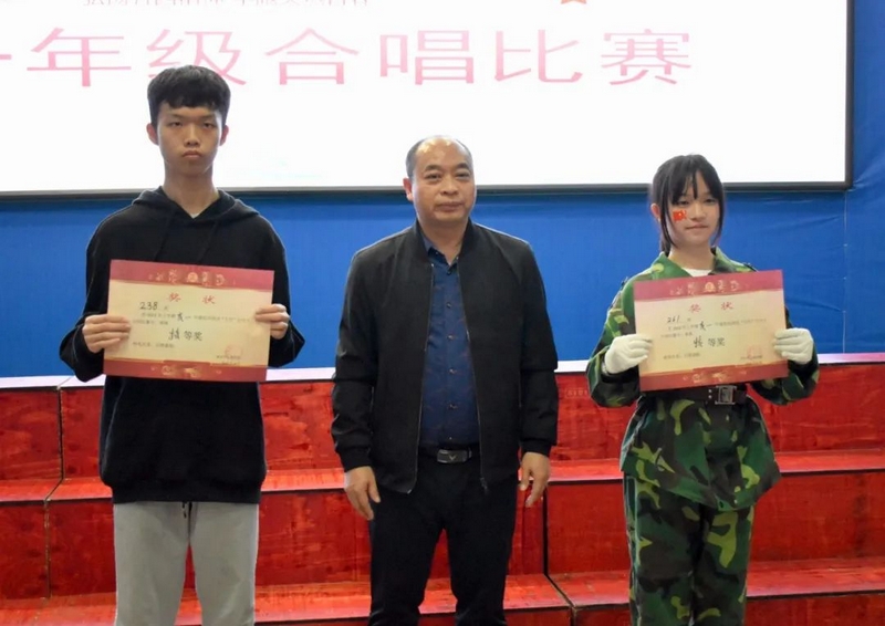 259班得分9.25分,报告厅沸腾了,尖叫声响成一片,下一个表演班级是260班,随着主持人的报幕,比赛有序进行。比赛开始前,静,很静,静得可以听得到几百颗心脏的律动。260班的指挥肖晴,是一位个子不高的女生,身材还有点微胖,她镇静在站在队伍前面,向评委鞠躬致意后,转身面对班级同学,缓缓地抬起双臂,手臂随着音乐节奏的变化而变化,全身摆动,手臂时而轻缓,时而平推,时而高举,时而下摆,整个人都沉浸在激越的乐声里,小小年纪就有了音乐大师的风范。更让人惊奇的是,她在第二首歌曲指挥之前,还跳了一段伦巴,让同学们眼前一亮,难道这就是指挥界的天花板?凭借肖晴同学的出色指挥260班获得了一等奖的殊荣。263班的匡冠丞同学,平常略带腼腆,让同学们刮目相看的是他竟然勇敢地承担了指挥的重任,以前他并没有指挥的经历。不会,没关系,学就是了。于是他向懂指挥的同学请教,没几天,指挥起来就有模有样了,在无数次的磨练中,他掌握了指挥技巧,增强了自信,赢得了尊重。252班,是一个外招班,人数只有23人,气场虽不足,但并没影响班级的发挥,他们有合唱有领唱还有腰鼓助阵,最终用辛勤的汗水换来了二等奖。斩获特等奖的是238班和261班。