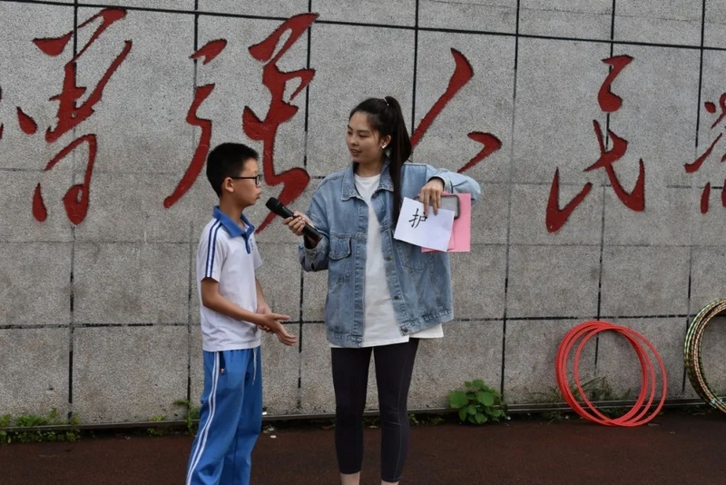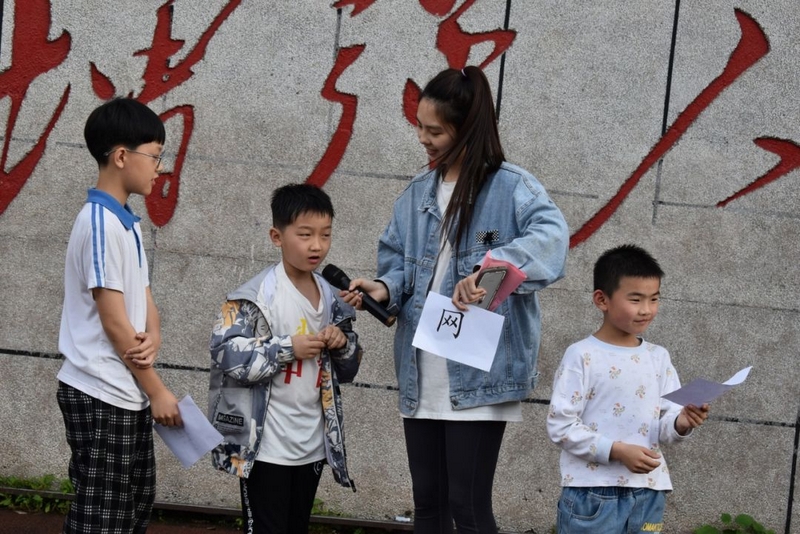 首先进行的是“套字生花”环节,主持人胡老师简单介绍了游戏规则,现场选取了六位同学上台。台上的同学面向观众排成一行,每个同学的旁边有一个红色的圈,正前方有五排小锥体,每个锥体下面压了一个汉字,参赛者要用圆圈套字,然后依字组词说句子。只见六个同学对准眼前的锥体,右手持圈弯腰前抛,有三人抛空,三人套中。其中一年级的王晨同学套中了一个“学”字,五年级的陈怡萱同学套中了一个“语”字,另一个四年级的男生套中了“严”字,他们分别组词并造句。王晨说:“学—上学—爸爸送我去上学”;陈怡萱说:“语—语文—语文老师很漂亮”;另一个同学分别说:“严—严格—数学老师对我们很严格;诗—古诗—李白写的古诗天下无敌;灯—灯光—商场的灯光五颜六色,非常漂亮”。一轮过后紧接着又来一轮,大约有四、五组同学先后上场,各自展现了自己的风采,也让大家体验了汉字独有的魅力。