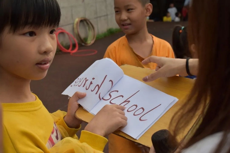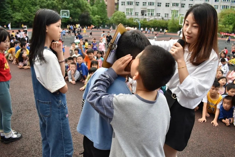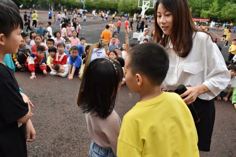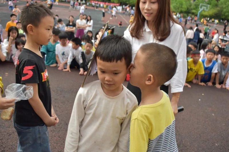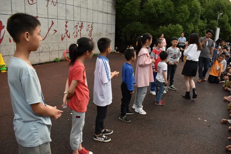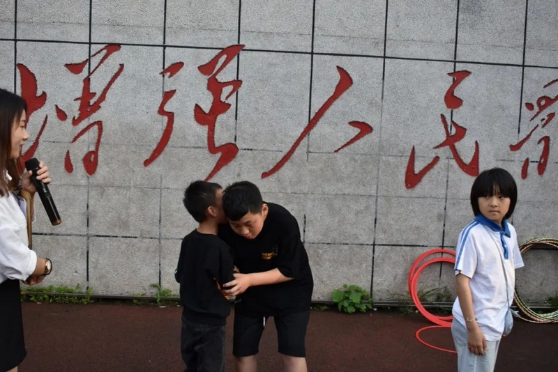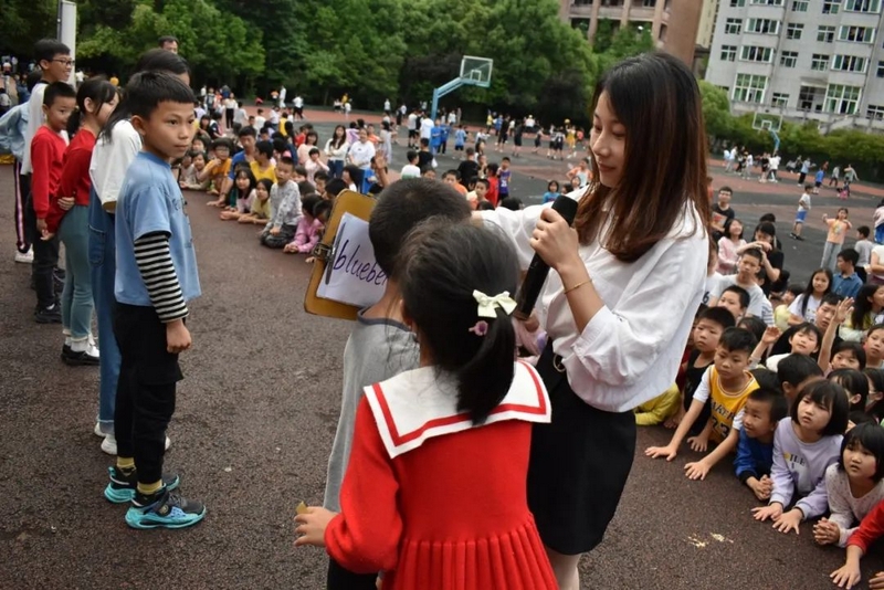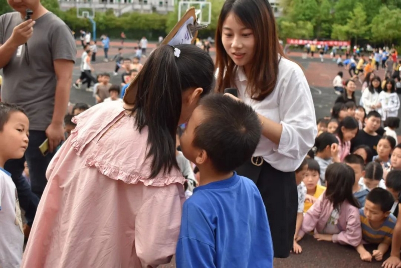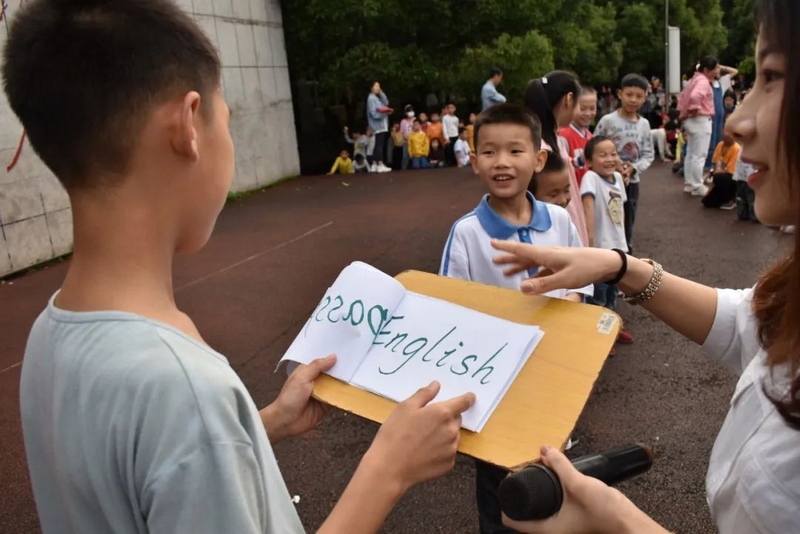 汉字的余音仍言犹在耳,英语的魅力又扑面而来。活动进入到了“千里传‘英’”的环节,该环节的游戏规则是:每轮选5-7个同学上台,排成一队,由Miss Liu小声告诉第一个同学英语单词,第一个同学再小声告诉第二个同学,依次类推,最后一位同学大声说出自己听到的英语单词。“Hello,every one!”美丽温婉的Miss Liu和着音乐的节拍款款地步入舞台中间,她左手持单词卡,右手握着话筒热情地和观众们打着招呼,一边介绍游戏规则,一边从人群中选出参赛选手。一年级的黄歆然、四年级的邓雨霏、谢志新等6名同学幸运地成为了首轮选手,他们在舞台中间排成一排,第一个女生抽出了一个单词“umbrella”,转身面向一年级的黄歆然,对着她的耳朵轻声说出了这个单词,黄歆然接着小声对着四年级的邓雨霏说,然后邓雨霏再对着谢志新说,经过五次传递,最后一位同学成功说出了单词“umbrella”。紧接着又有罗子钊、周卓越、黄俊杰、刘诗涵等近20名学生分三组上台参与,分别传递了“English”“school”“blueberry”这三个单词,每一组的最后一名同学都能准确说出本组所传递的单词,真正地彰显了我们学校英语教育的丰硕成果。参赛选手的精彩表现赢得了现场老师和同学们的阵阵掌声,更触发了观众们参与活动的如火激情,“选我!选我!”的呐喊声此起彼伏,引得摄影老师不断穿行在人群中快门频闪,定格了一个个快乐又感人的精彩画面,真可谓:男女幼少同场竞技,古今中外共试比拼。