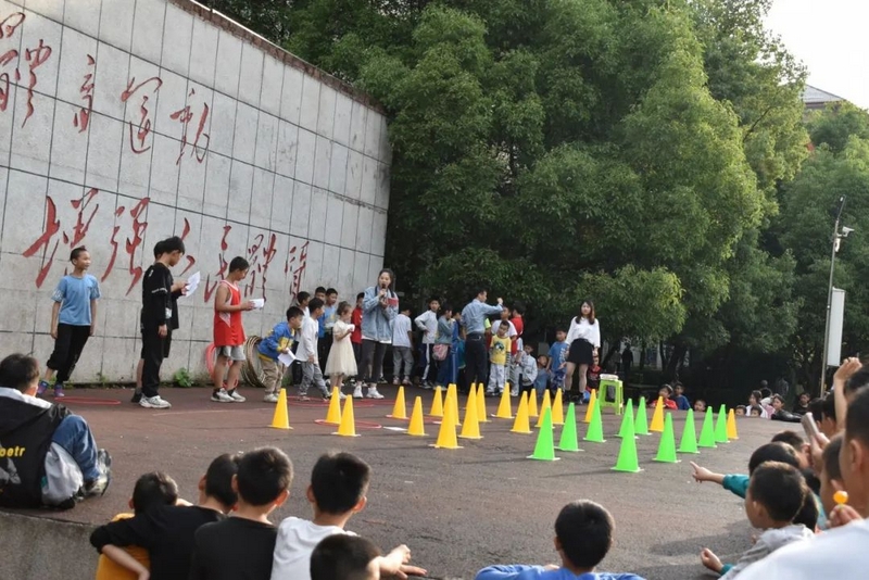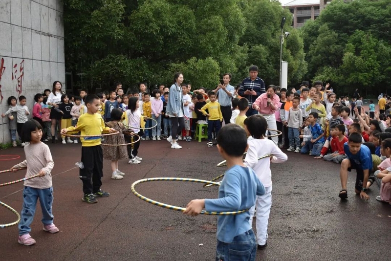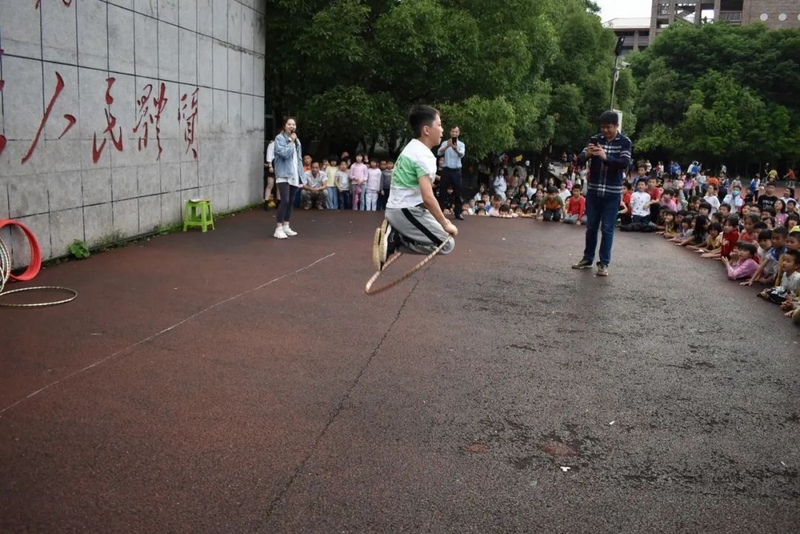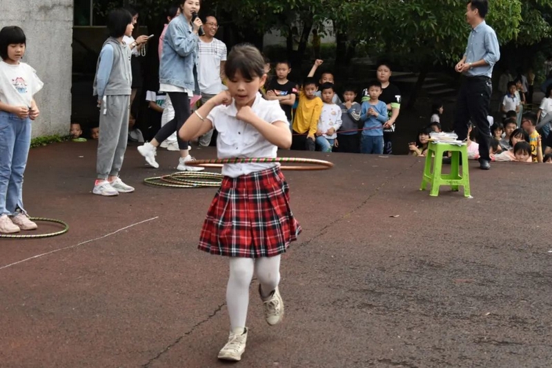 对于正源的学生来说,“语数政史皆拿手,艺体书英均所长”。瞧,文化类的游戏才结束,艺体类的挑战又上演。本次活动的第三个环节就是“挑战呼啦圈”。该环节规则如下:先请出一年级转呼啦圈的高手们展示,下面同学可以对他们发起挑战。提示:一年级同学如果用腰转,你挑战他,请你也用腰转;一年级同学如果用脖子转,你挑战他,也用脖子转;如果一年级同学是跪着转,你挑战他,也必须跪着转;如果他边走边转,挑战者也要一样。本环节一年级的语文备课组长邓晶老师现身解说并精选擂主,从一年级421-424班中挑选出了黄志华、谭绍辉、刘书雅、何艾彤、胡芯、谷慧妍等十名呼啦圈高手上台展示,他们有的站正转,有的侧身转,还有的走着转,特别是423班谷慧妍,看着个儿小,实则能量大,转着那个呼啦圈呼呼作响、虎虎生威。更有421班的陈延同学,跪着也能转呼啦圈。只见他双膝跪地,腰杆挺直,双手将呼啦圈套在腰上一甩,那看似笨拙的呼啦圈就非常灵动地转了起来,时高时低,时快时慢,转的那叫一个人圈合一,出神入化。他们表演完以后,就有诸多挑战者争先恐后地跳上台来一展身手。本以为一年级的孩子已经很厉害,殊不知强中自有强中手,一山更比一山高。台上的挑战者有的把呼啦圈在腰臀之间自由切换,转动自如,有的直接转两个呼啦圈,还有的跑着转、跳着转,惊得我们的美女主持人胡益静老师目瞪口呆,也让现场的观众眼花缭乱,叹为观止。