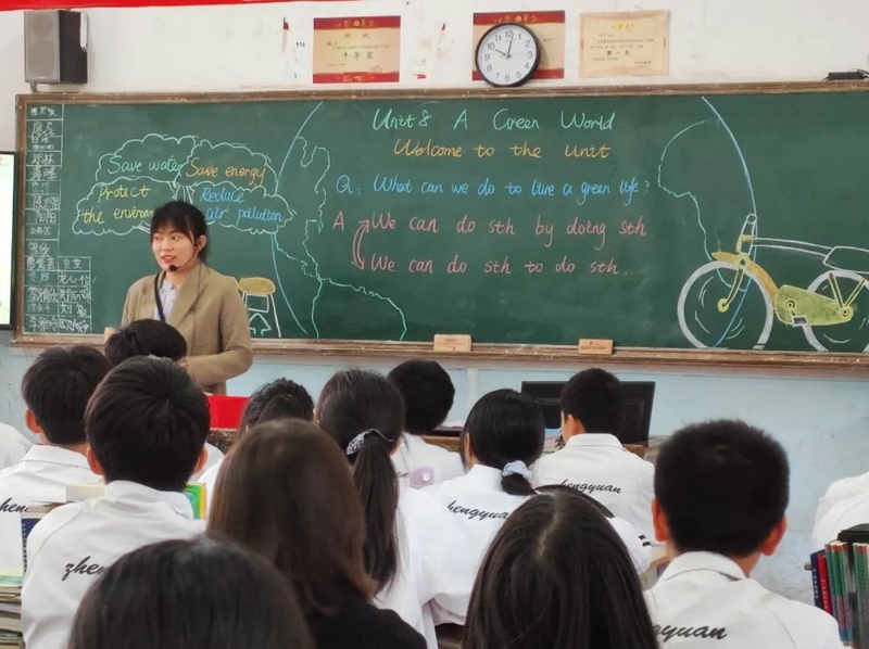 陈梦琼老师讲解的是How to live a green life ?导入——单词——短语——句子——实例观看——实例操练——报告,层层递进中,同学们既掌握了How to live a green life? 同时对句型We can do sth by doing sth 和We can do sth. to do sth 也是应用自如了。一节课下来,大家似乎已经沐浴在一个生机盎然的绿色世界里了。