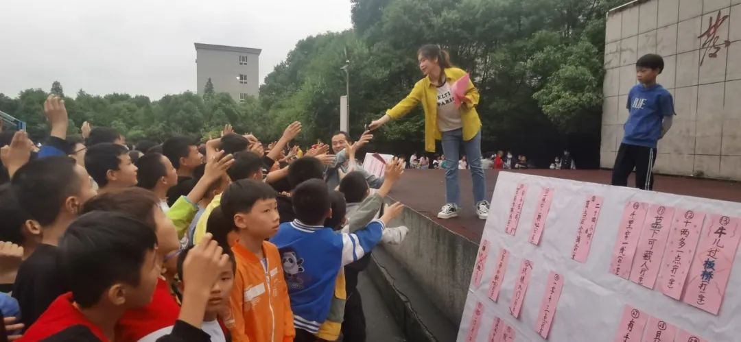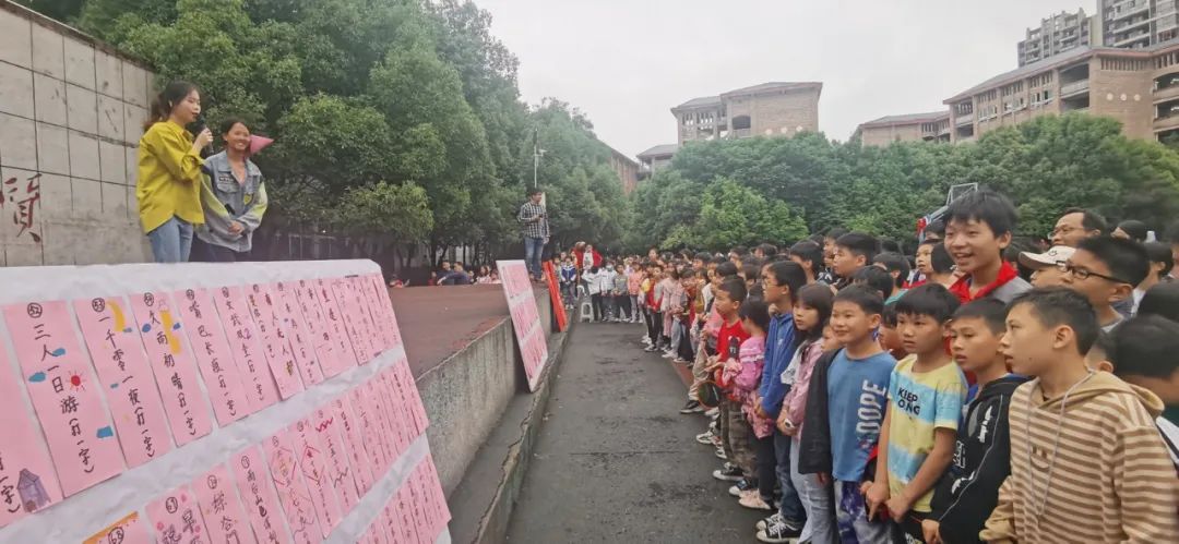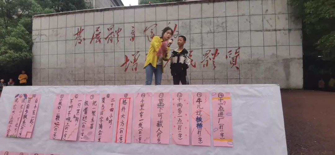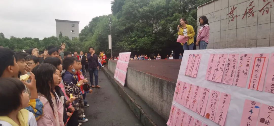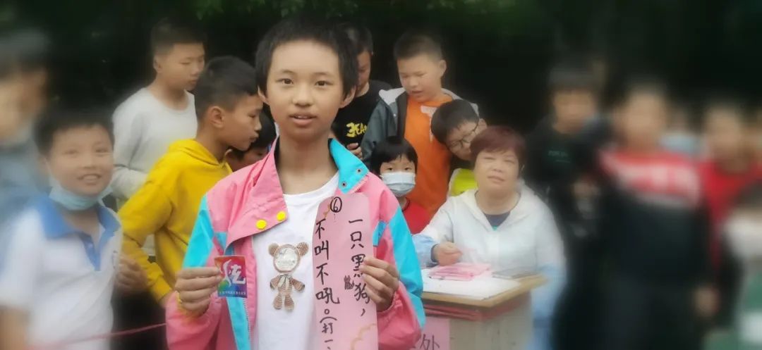 活动现场,同学们围在谜面前凝神思考,兴趣盎然。猜中者,兴高采烈,揭走谜面,兑换奖品,猜错的,不气不馁,再接再厉,整个操场成为欢乐的海洋。