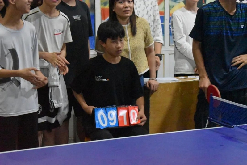 终于,在第七局中谭翔宇同学迎来了赛点,在这千钧一发之际,只见刘泰翔发了一个很低的球,谭翔宇轻轻地往上一翘,球偏高地在刘泰翔那边着陆,只见刘泰翔轻轻跳起,抓住机会,猛一抽,谭翔宇后退一步扬起球拍轻轻地把球推了过去,刘泰翔立即把球挡回了谭翔宇的左手边,谭翔宇向前一步用一记强有力的反手抽,球向离了弦的箭一样向那边台子擦了边去。此时场上比分15:13,谭翔宇以2分微弱的优势成功卫冕了本次男子单打冠军。