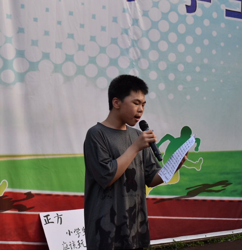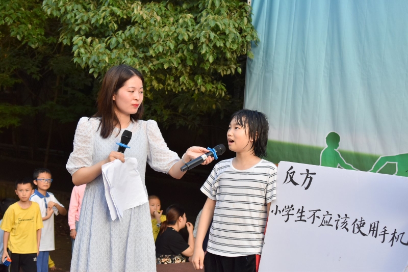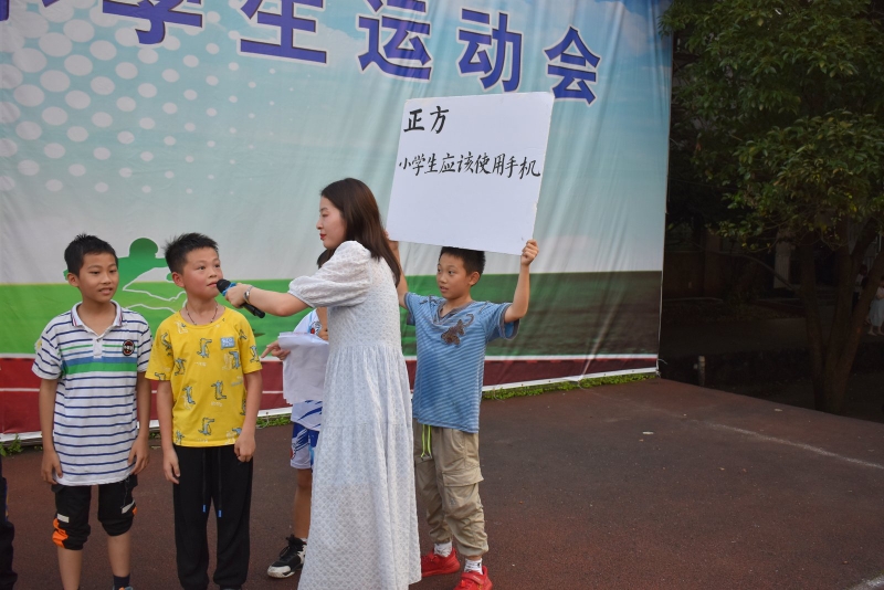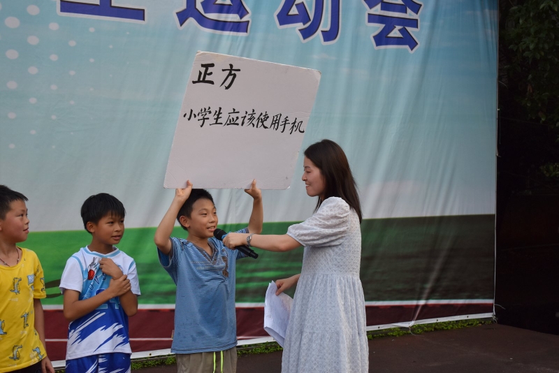 歌声终了,活动进入第二环节:辩论大赛。第一场辩论围绕“小学生应不应该使用手机?”展开。台下观众兴趣浓厚,积极响应,踊跃举手。辩论团队正方、反方各六人,均由主持人临时从台下观众中随机挑选组成。正反双方,各持己见,唇枪舌战,你来我往,互不相让,谁也说服不了谁,只好作罢。