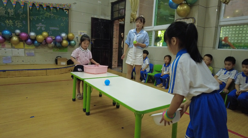 紧接着,老师们组织小朋友们在教室里开展丰富多彩的游戏活动,每个孩子都参与其中。第一个游戏活动是《桌面滚接球》。小班和大班的孩子合作,由小班孩子将10个海洋球逐个地从桌面的一端滚过去,大班的孩子拿着筐在桌子的另一端接球。接到球最多的小组获得胜利。滚球的小朋友由于年龄小,手眼还不那么协调,滚球的时候一会儿滚到了左边,一会儿滚到了右边;有时滚得太慢,球都掉不下去,有时又力度太大,直接从筐里跳出去了。不过这可难不倒我们大班的小朋友,他们眼明手快,见招拆招,将球球们通通收入囊中。