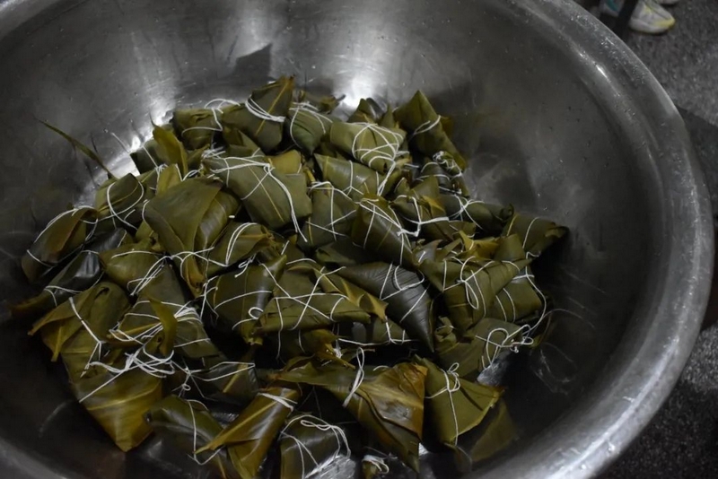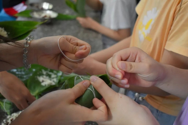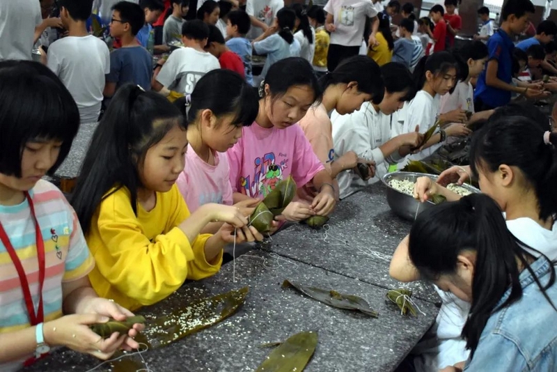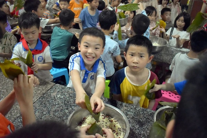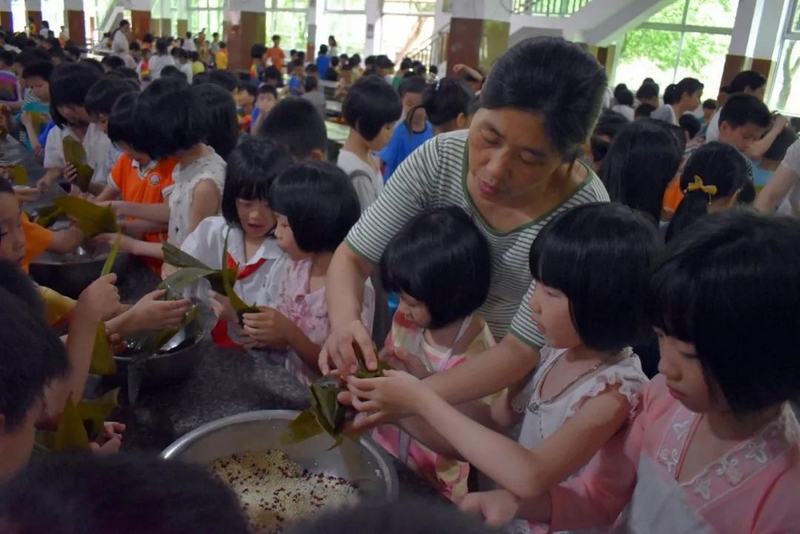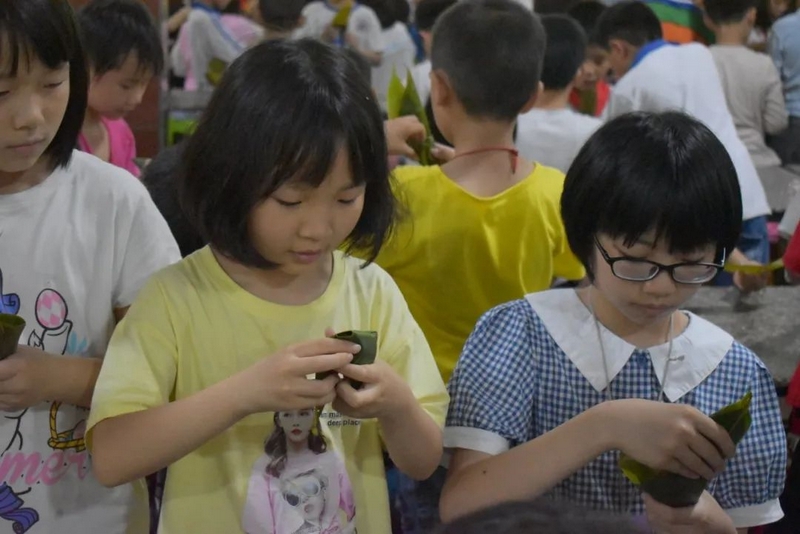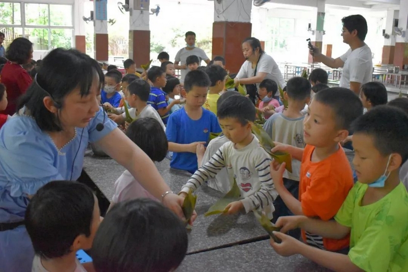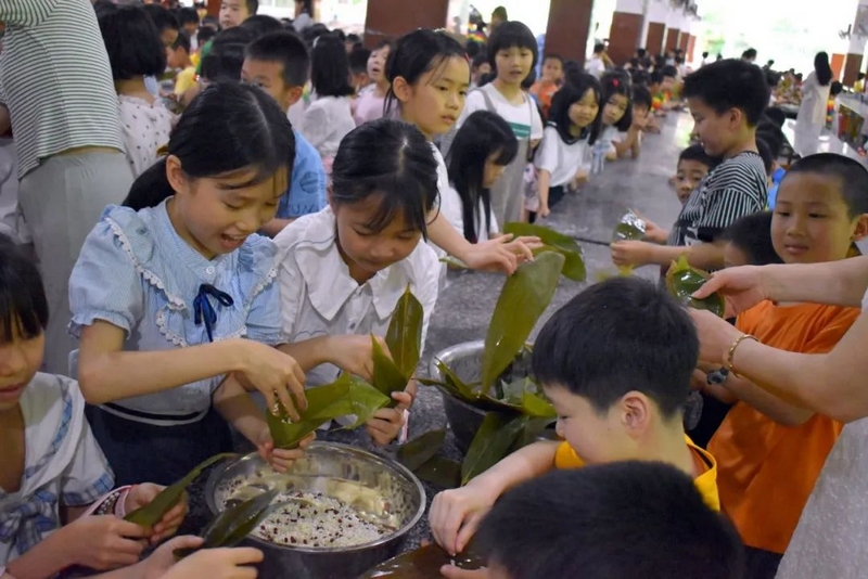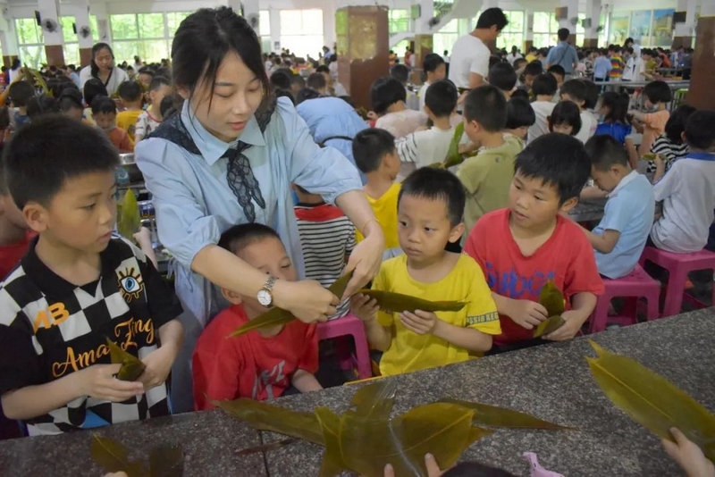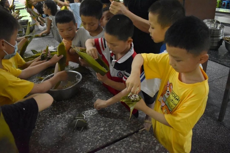 人手几张粽叶,每桌一盆米豆,朝夕相伴的小伙伴们围成堆、团成团,坐的坐、站的站,有说有笑、兴致勃勃。“五色新丝缠角粽,叶里黄鹂时一弄。”抽一片蒲叶,叠一方角锥,握一把米豆,扯一根细绳,包一份甜蜜,闹一阵欢声笑语。