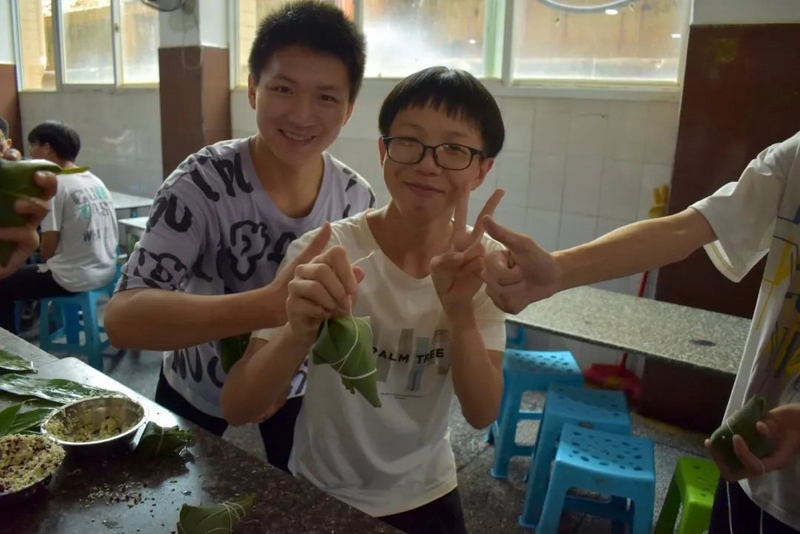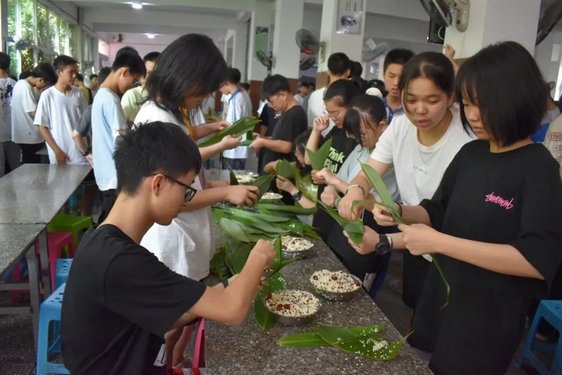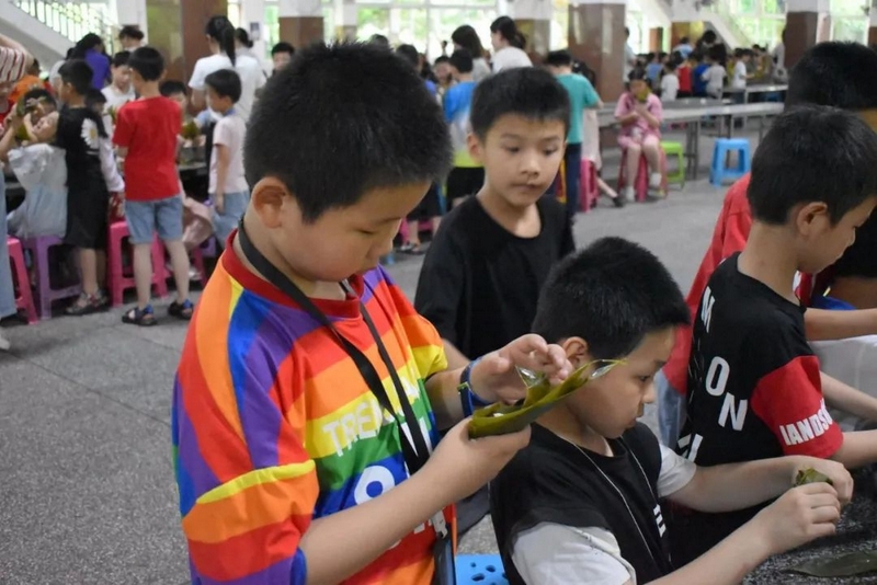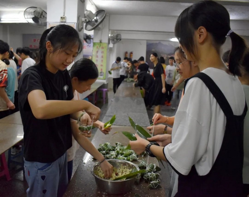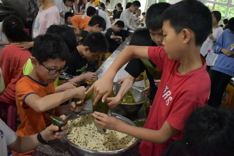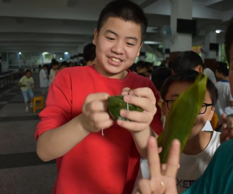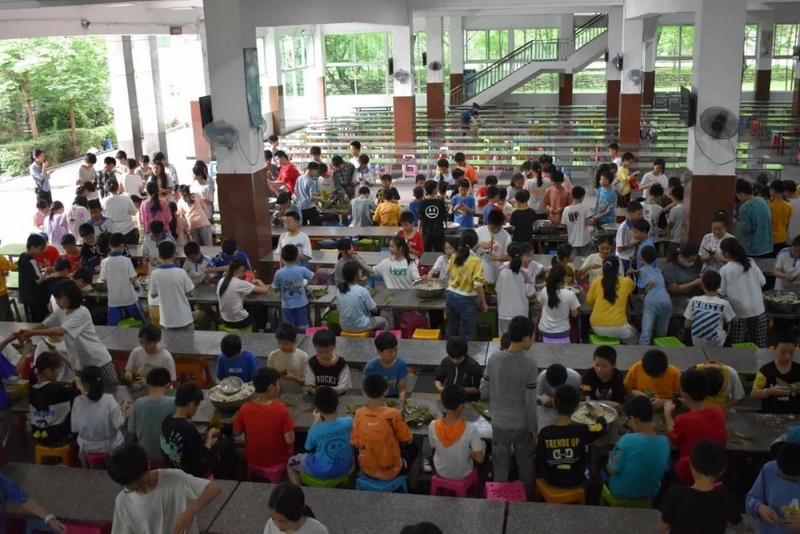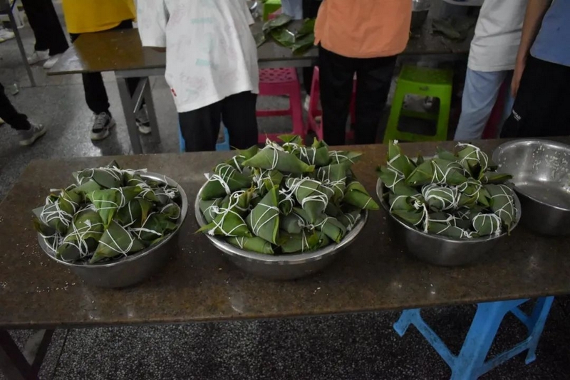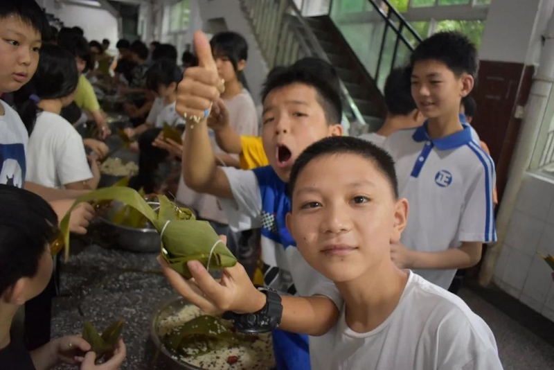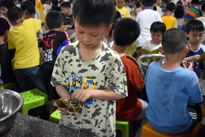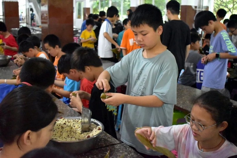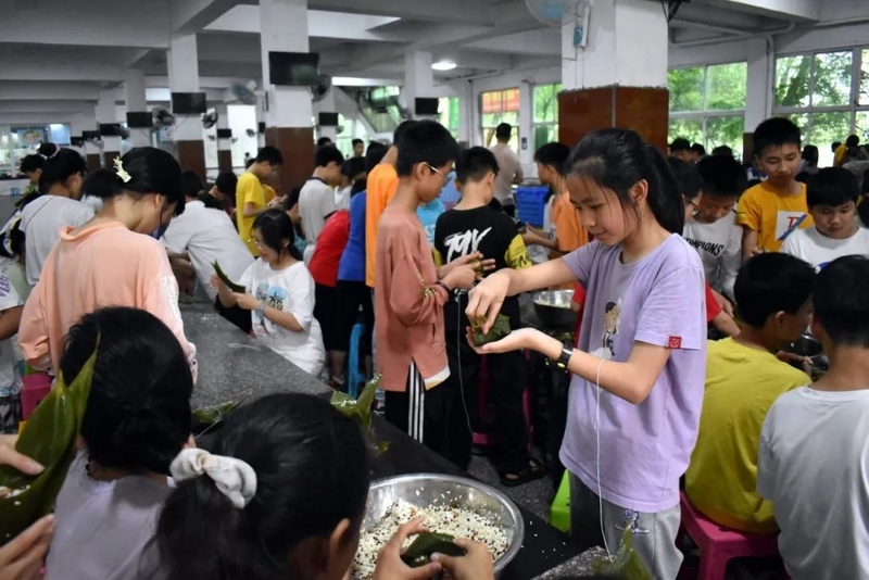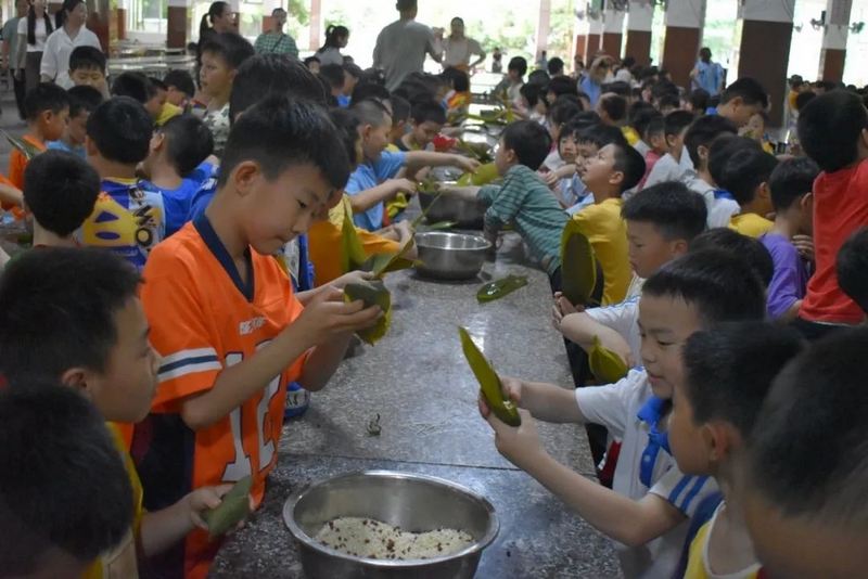 早读过后,刚刚开过早餐的5个食堂霎时又热闹起来,小学、初中、高中,各年级学生陆续涌进食堂。每逢端午,到食堂上一节别开生面的“包粽子”手工课是正源的传统。