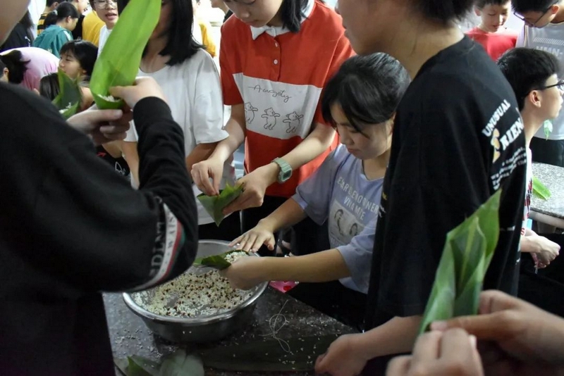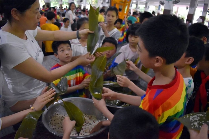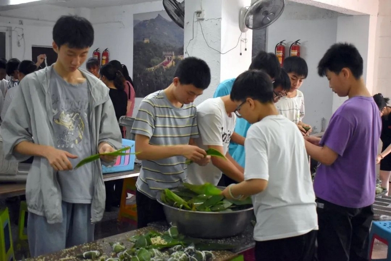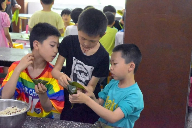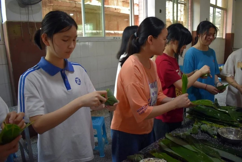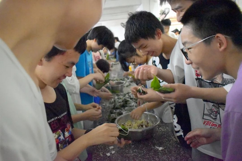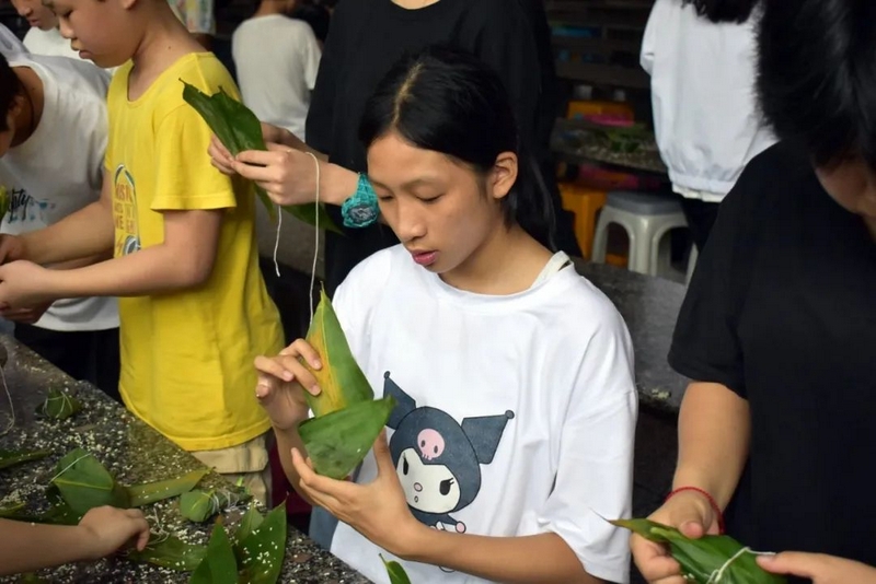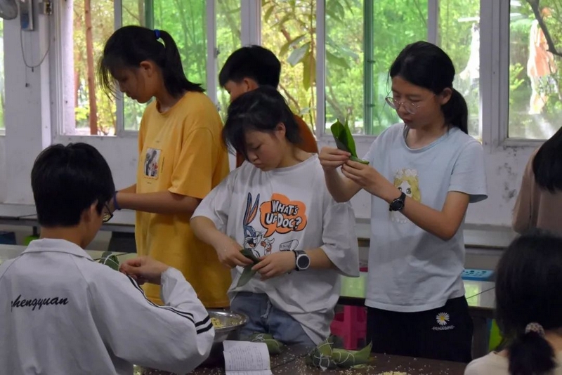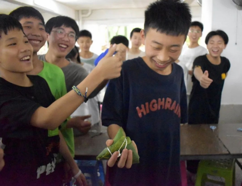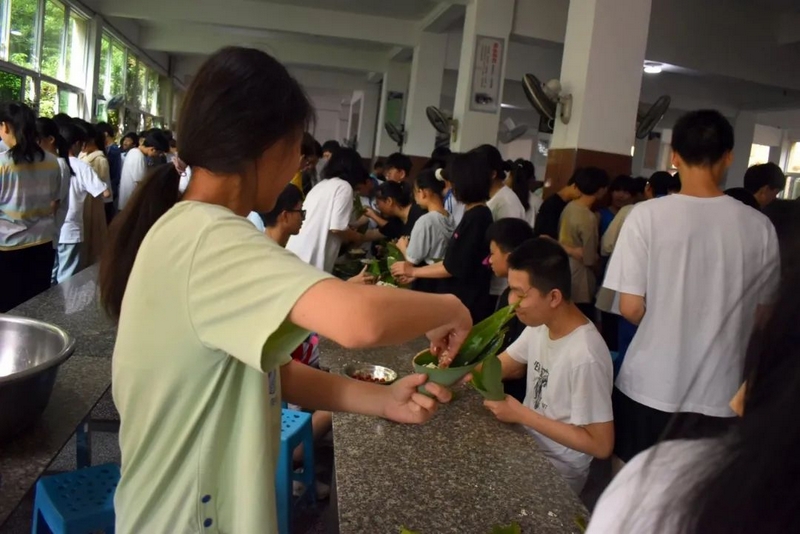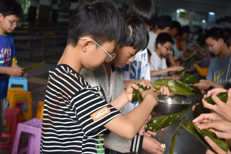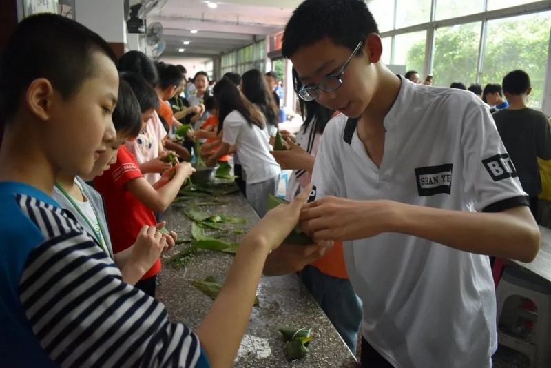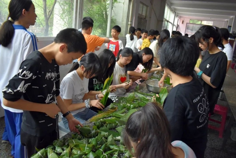 早读过后,刚刚开过早餐的5个食堂霎时又热闹起来,小学、初中、高中,各年级学生陆续涌进食堂。每逢端午,到食堂上一节别开生面的“包粽子”手工课是正源的传统。