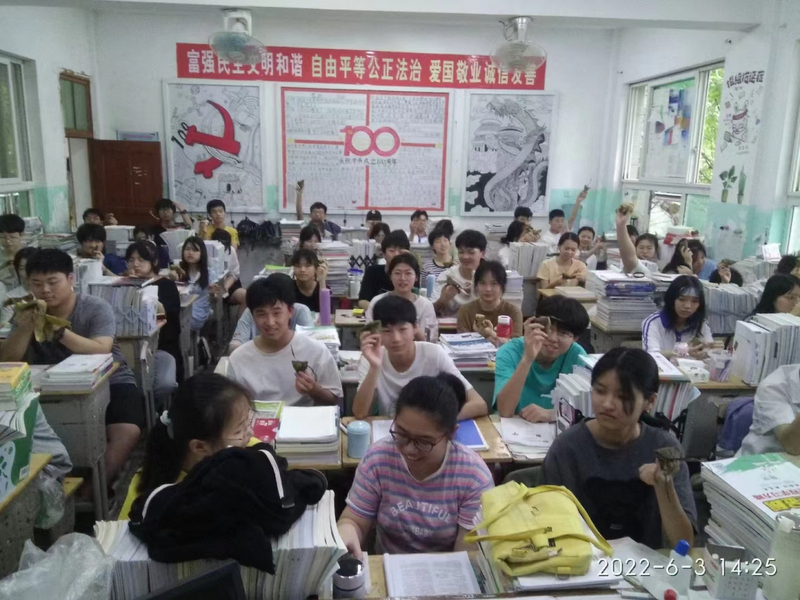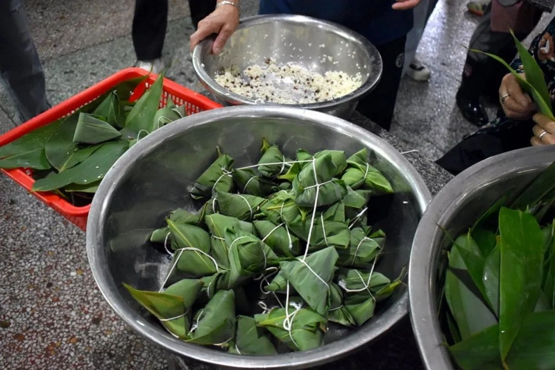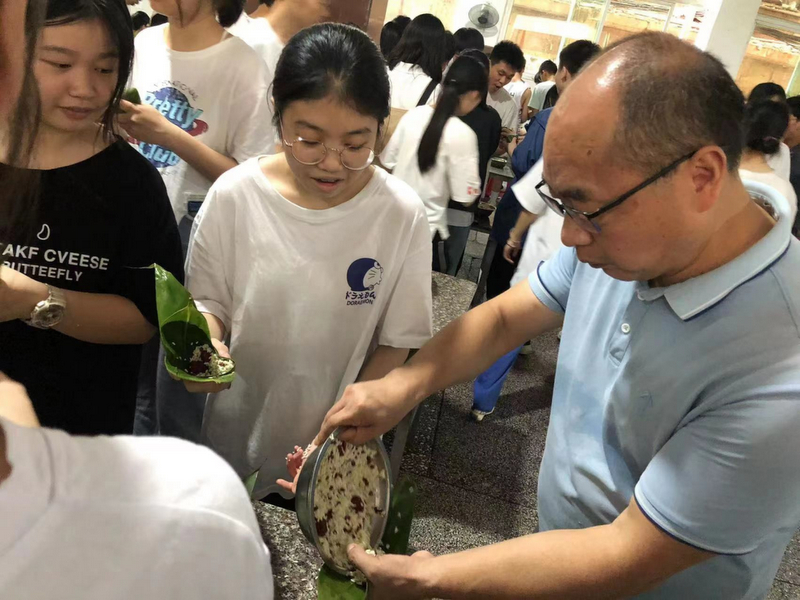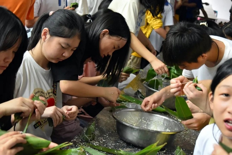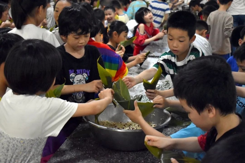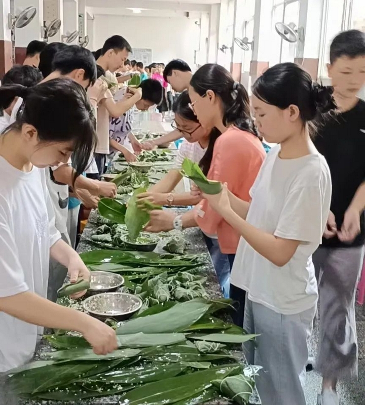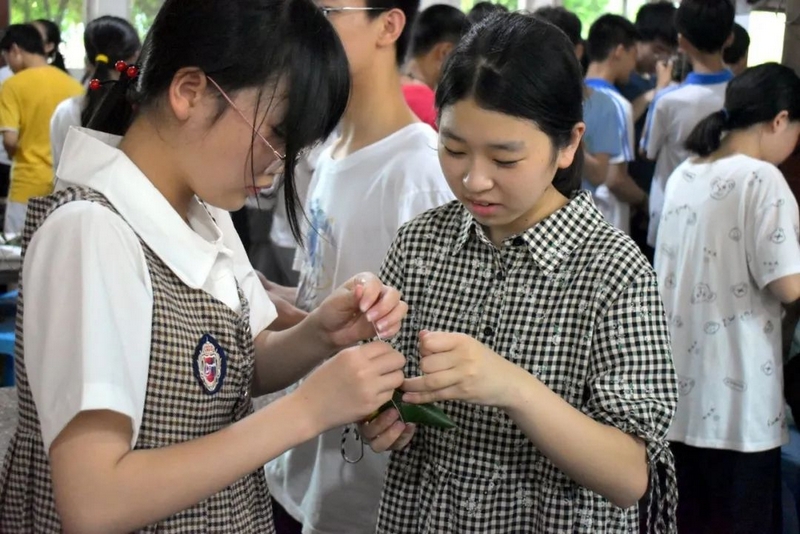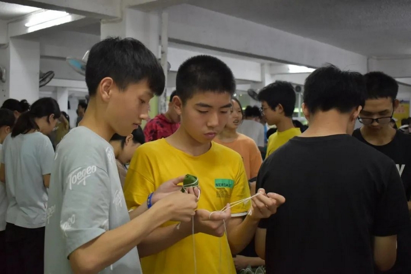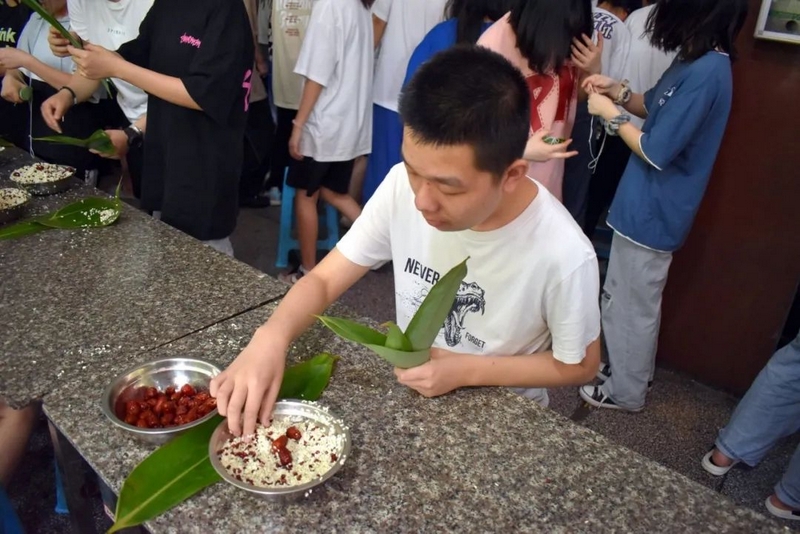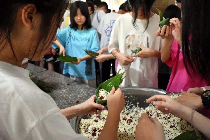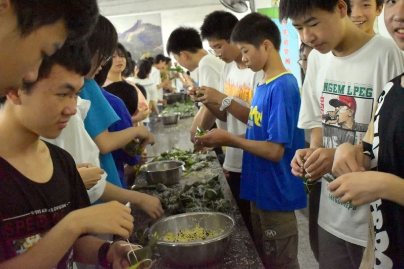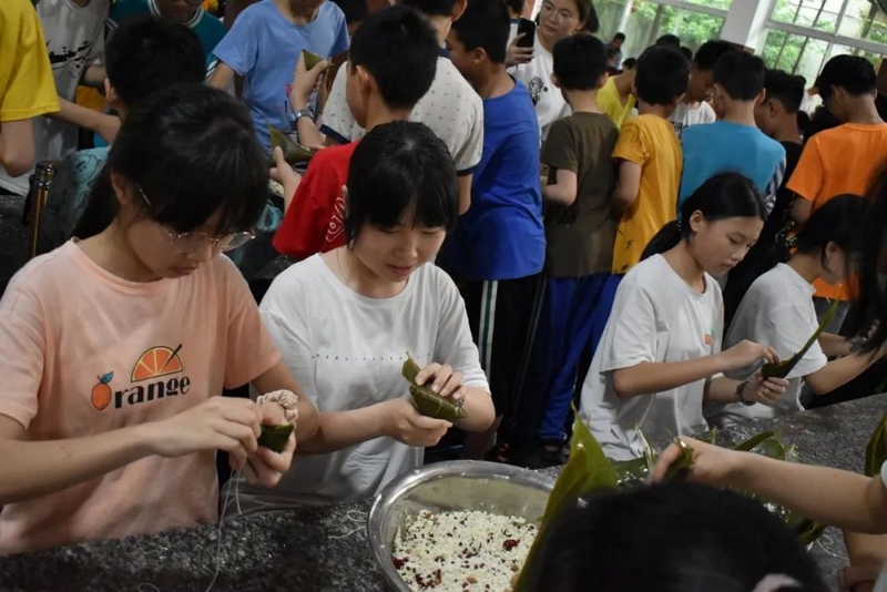 早读过后,刚刚开过早餐的5个食堂霎时又热闹起来,小学、初中、高中,各年级学生陆续涌进食堂。每逢端午,到食堂上一节别开生面的“包粽子”手工课是正源的传统。